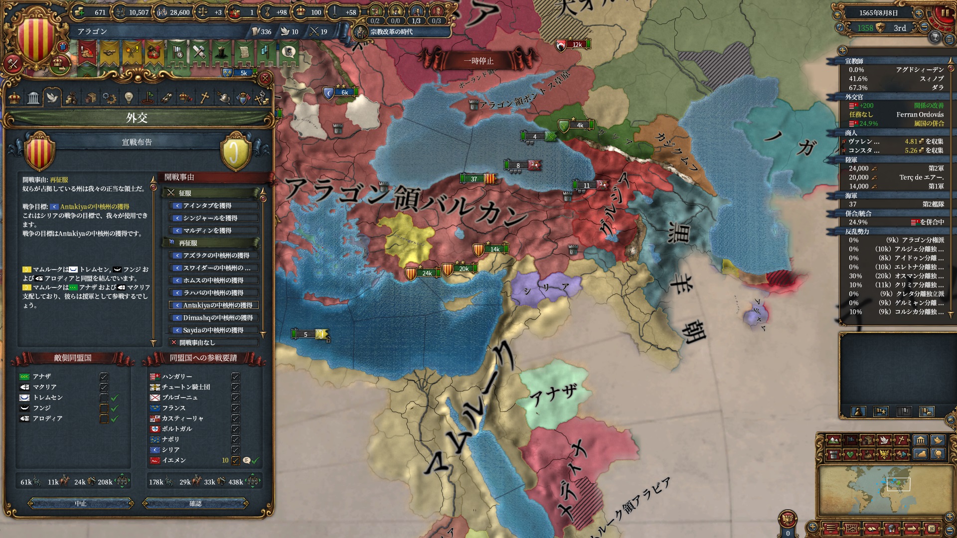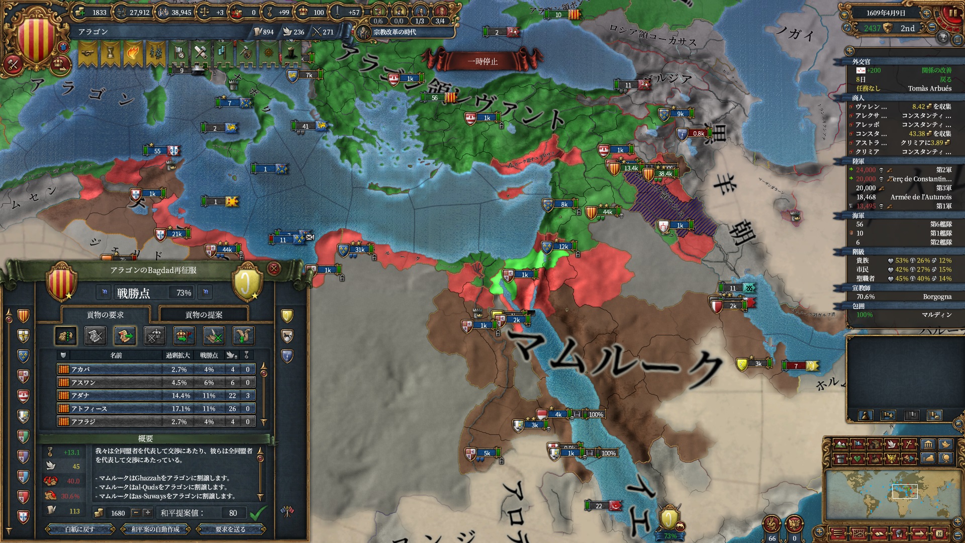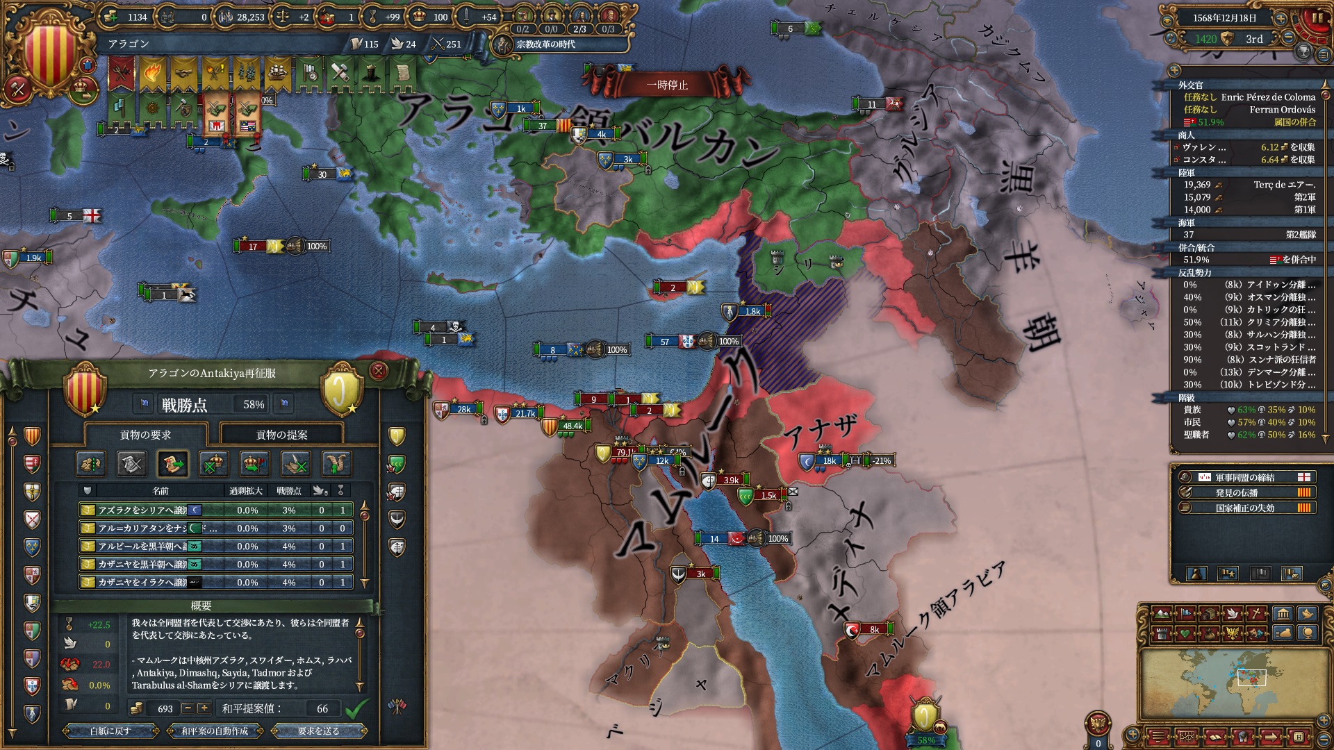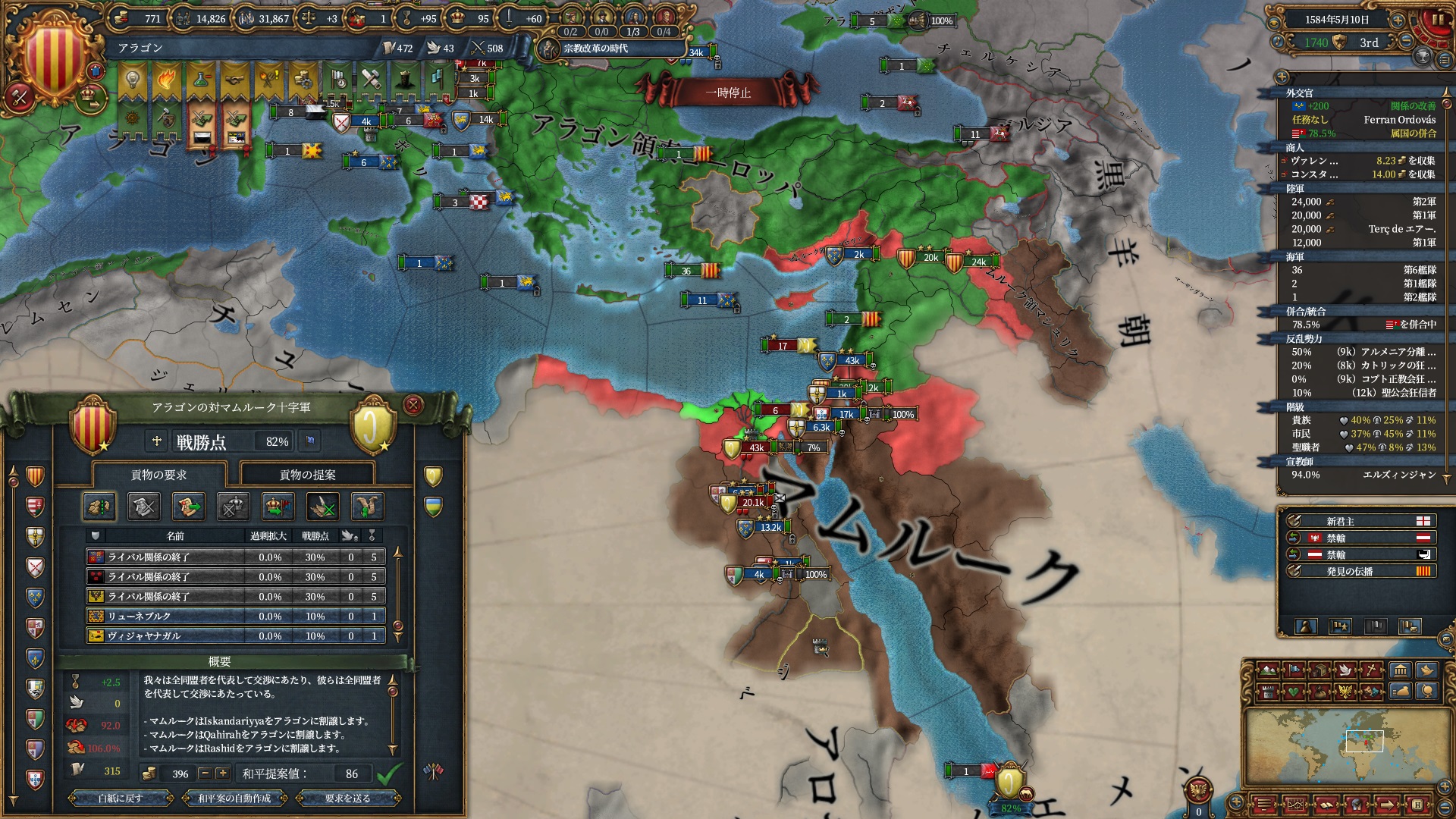 マムルークは包囲網対策としては優れているのためシリア返還させつつ同盟継続していますが、交易の収入にも大きく関わる地域の為いつ頃切るか悩んでいる今日この頃。