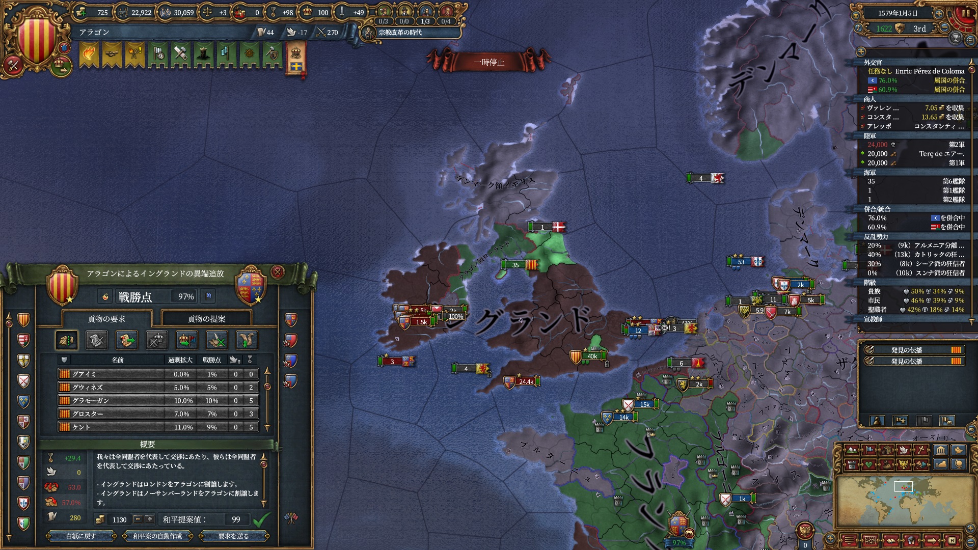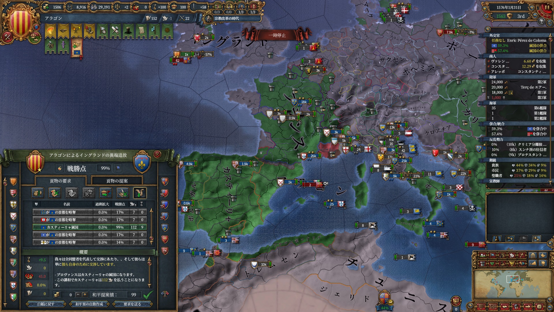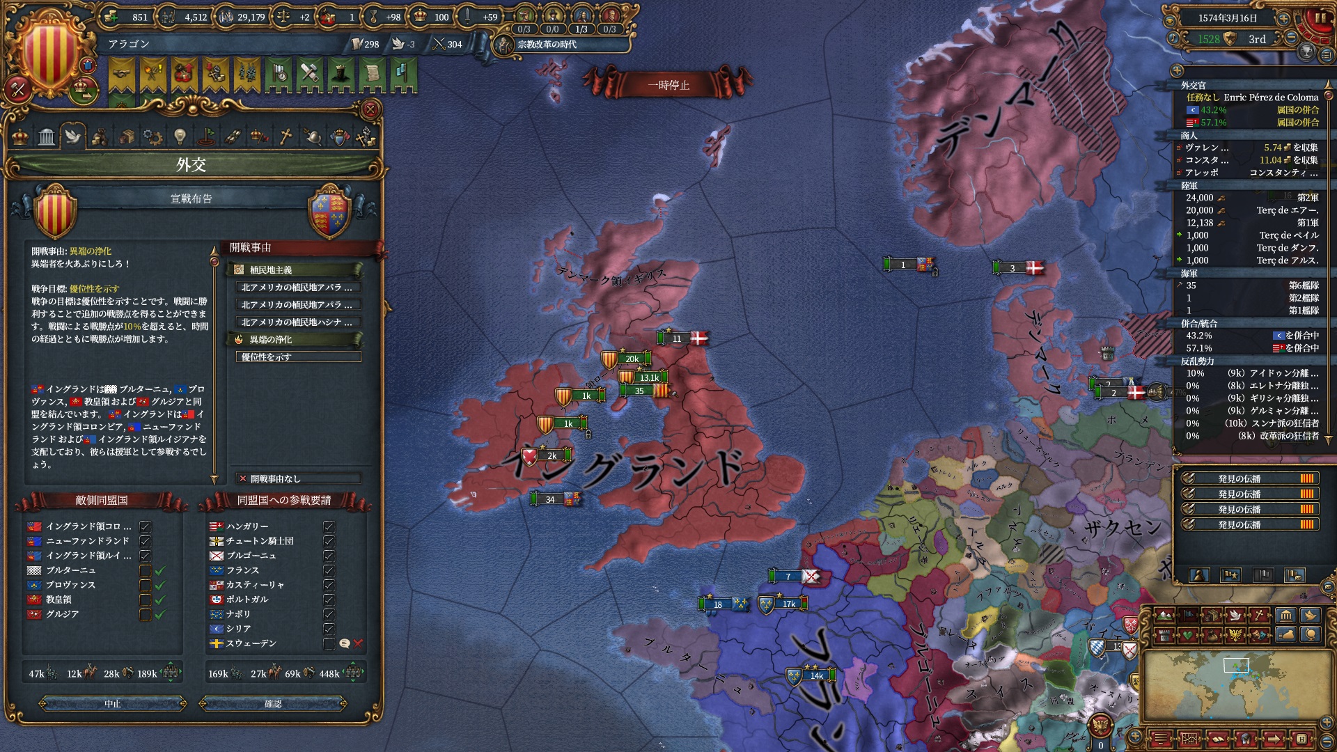 イングランドはロンドンも失い巨大な属国を統制する力は残っておりませんが停戦中のため侵攻できません。ぐぬぬ。