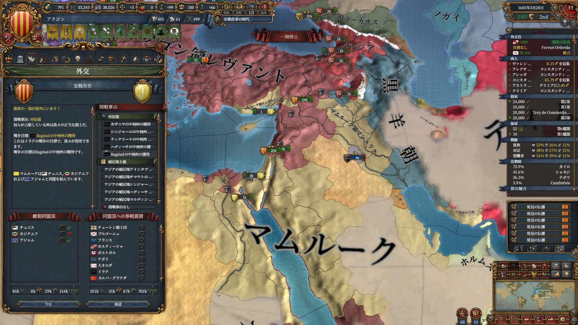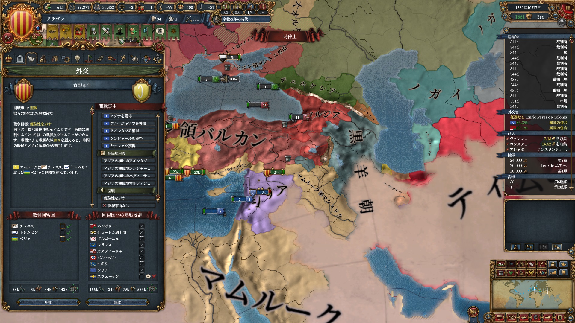 またシリアのコア返還を行っていくと本国と黒羊朝方面でマムルーク領が分断され凄い領土欲を燃やし始めるため割り切って同盟破棄します。