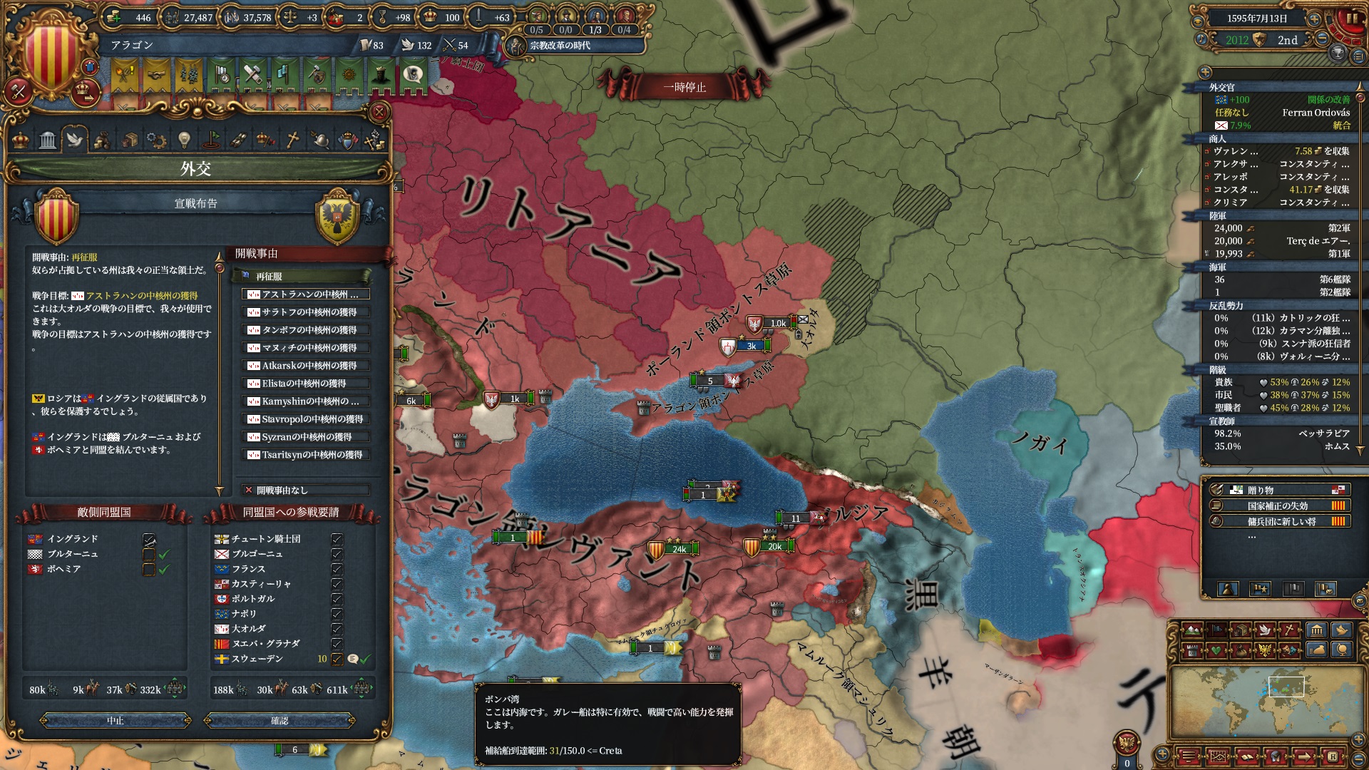ロシアは正教会国家なのでOF的には後で食べれば良いのですがアストラハンノードの富が流しやすくなる事と、下手に強すぎても困るため一撃だけ入れておきます。あとは独立戦争でイングランドと分離してくれるのを待つだけです。