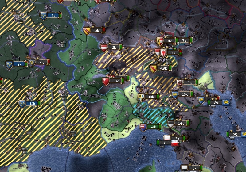 なお他にはフランス同君CBが得られるミッションもありますが、HRE外から始まる関係で前提条件となるスイス侵攻が面倒な上にプロヴァンス・ブルゴーニュ・パリを領有してようやくフランス同君となるのでこちらは達成が遅めになります(HRE解体やスイス離脱を駆使すれば達成できない事は無いですが)。