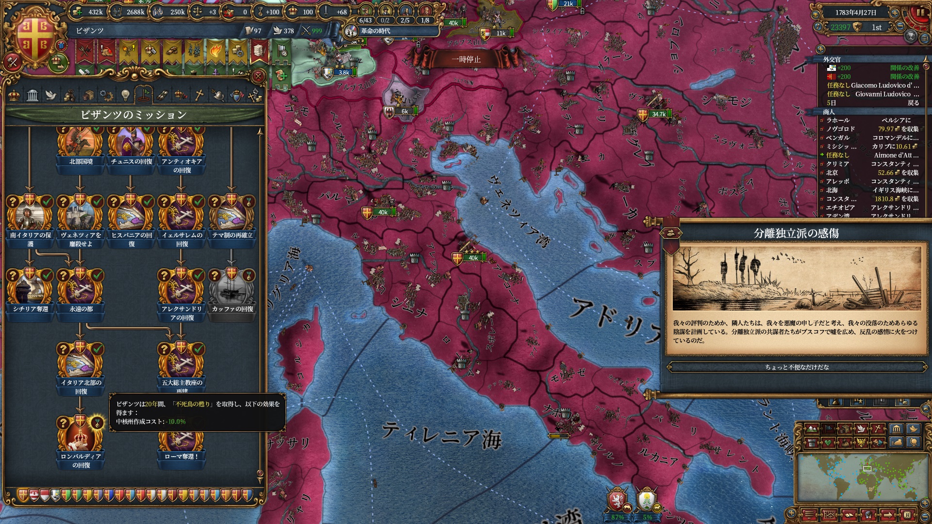 20年限定ですがコア化コスト-10%が復活しました。統治点はボロボロなので少しでも節約したいところです。