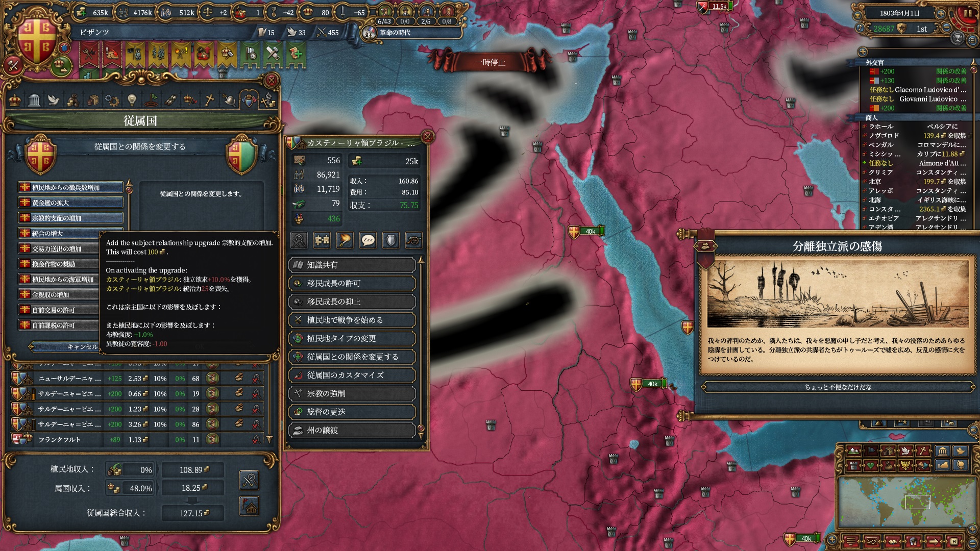 植民地国家はお金を上げても改宗してくれないし異教の寛容度-1もNIで帳消しなのでただただ疑問です。