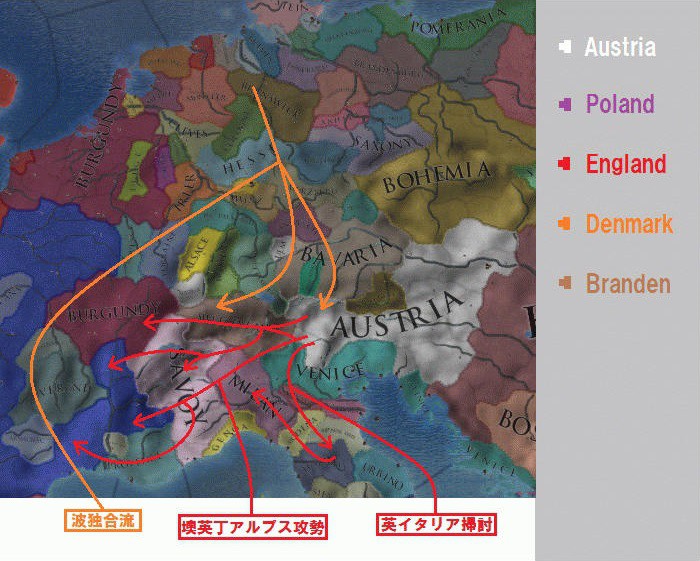 不意を突かれながらも三国の連携プレーでHRE軍を殲滅し、アルプスでは逆侵攻をかけました