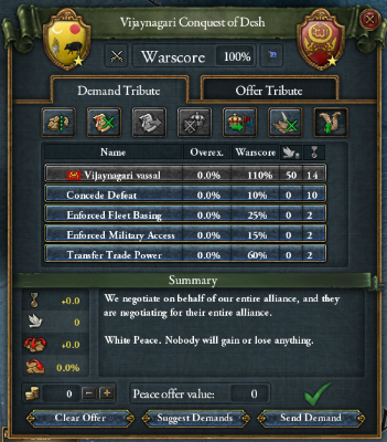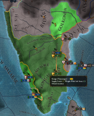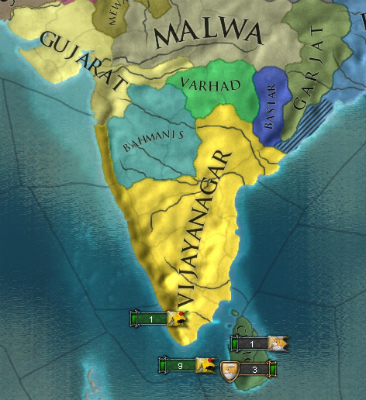 南西の小国家たちと同盟や婚姻を結ぶミッションをこなして外交点を稼ぎつつ、Raichur Doab獲得およびGolkonda解放でBahmanisと講和。