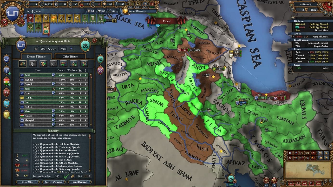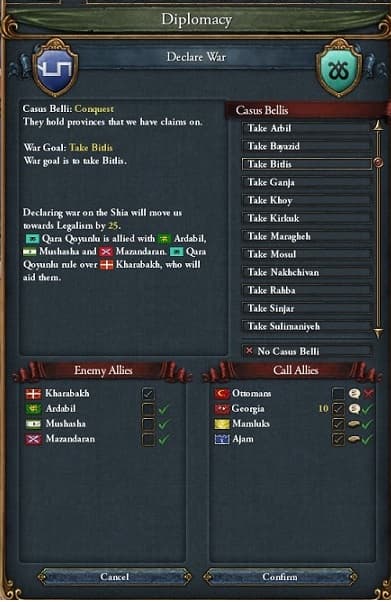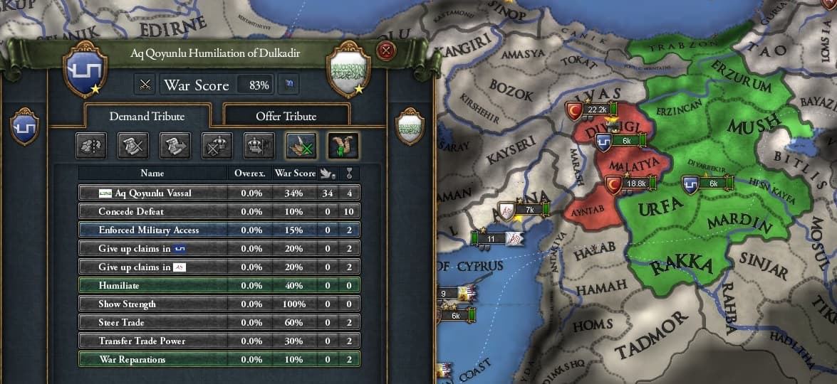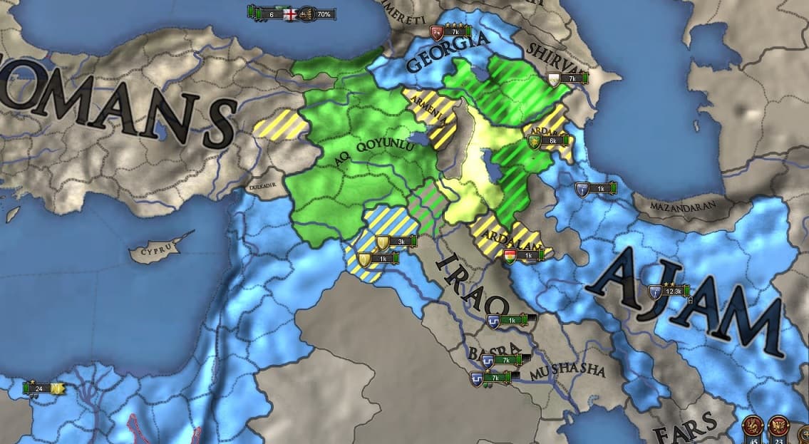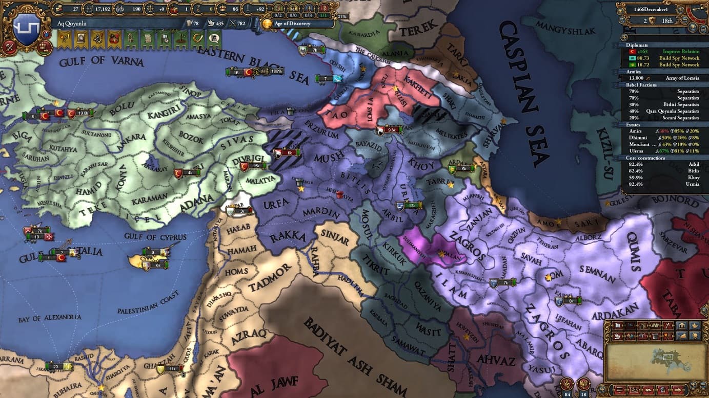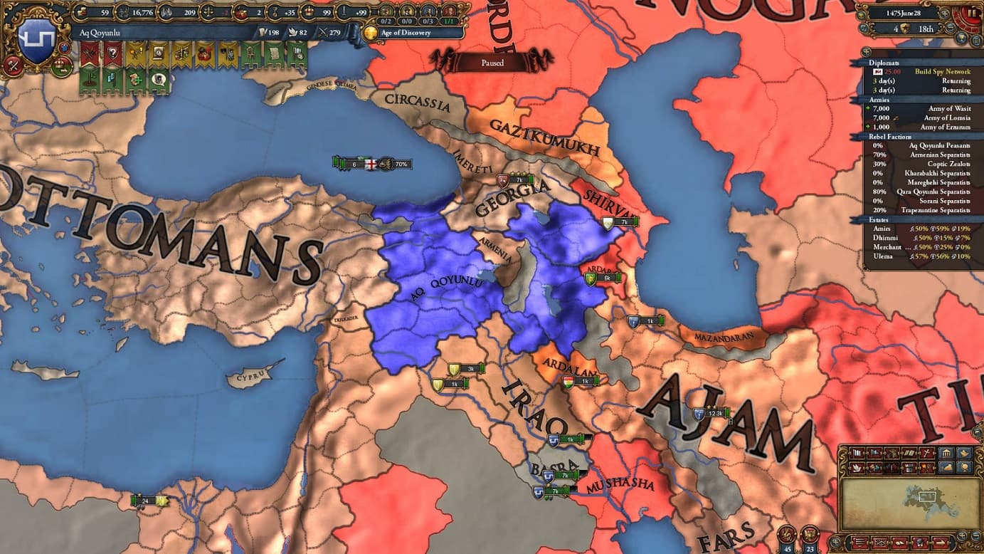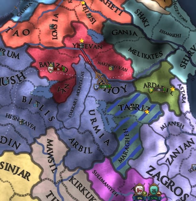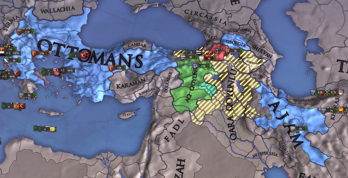 さらなる囲い込みと同盟国の拡張のため、Samtskhe、Trebizond、Dulkadirと立て続けに戦争し史実通りに勢力を蓄えていきます。