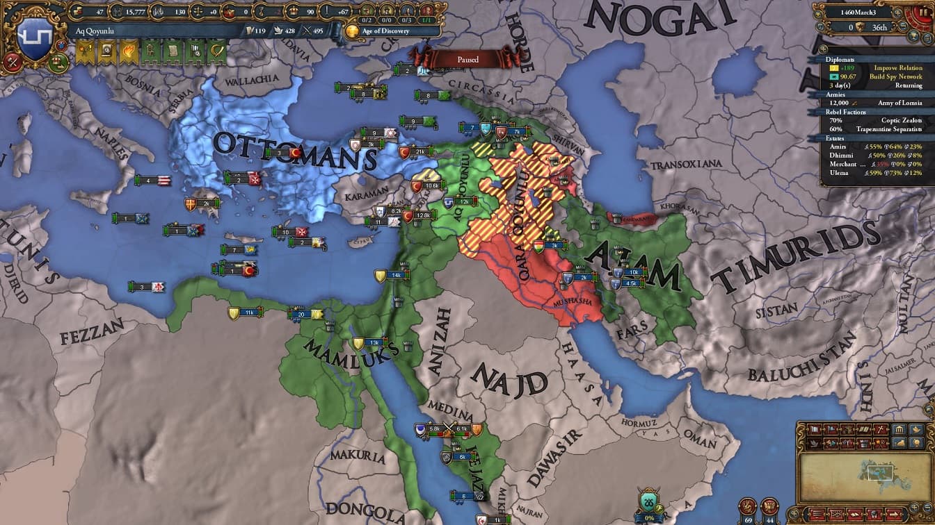 実績達成のつけは大きく、合計3度の協定違反と領土拡張ではOttomansの同盟離脱と中東全域の包囲網を残しました。同盟国であるAjam、Mamluksも過剰拡大値がすでに50を超えています。