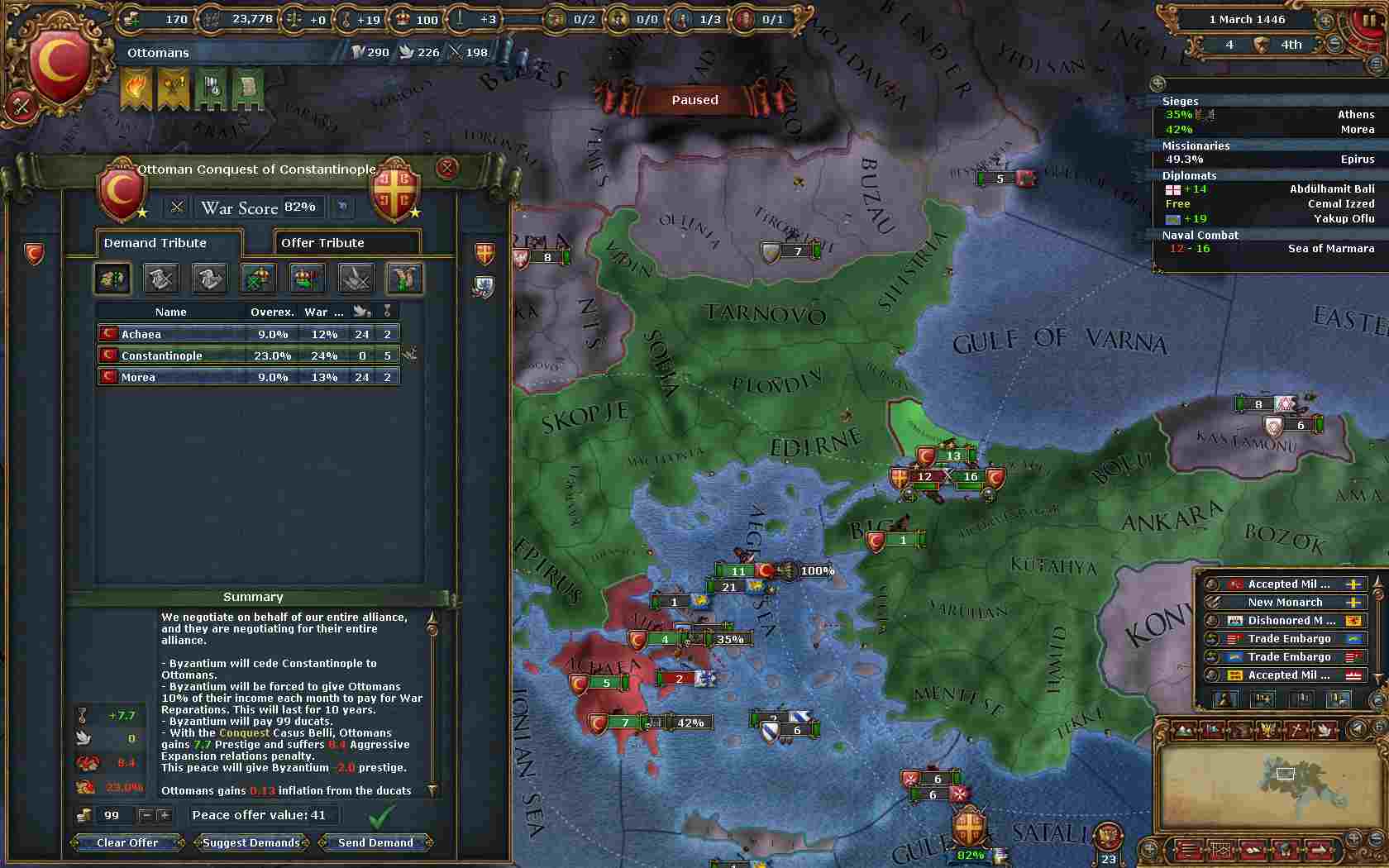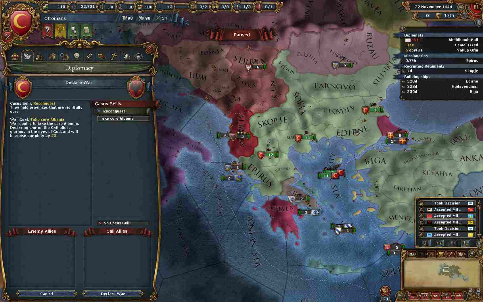 Make Constantinople Capitalのディシジョン後、間髪入れずに周辺国家からオスマンのコアを回収する為に宣戦。