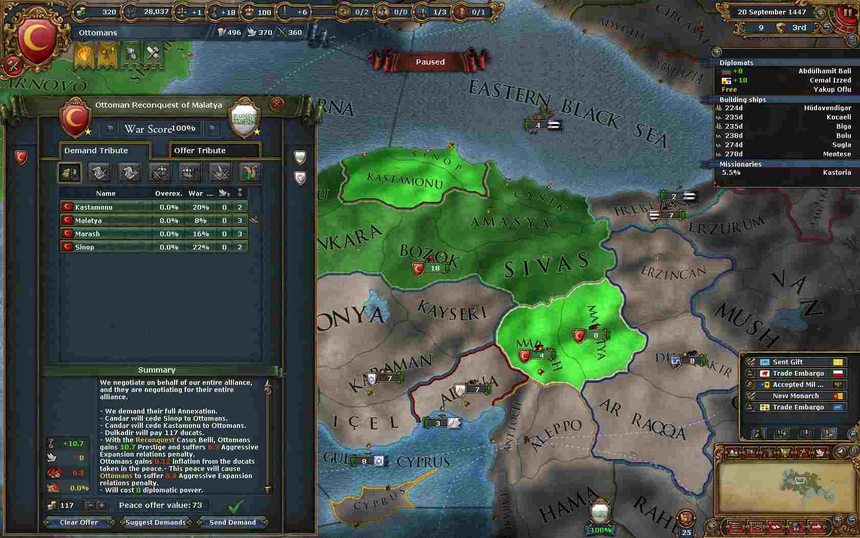周辺国の同盟状況によりますが今回はDulkadirに宣戦し、付いて来たCandar諸共完全併合。