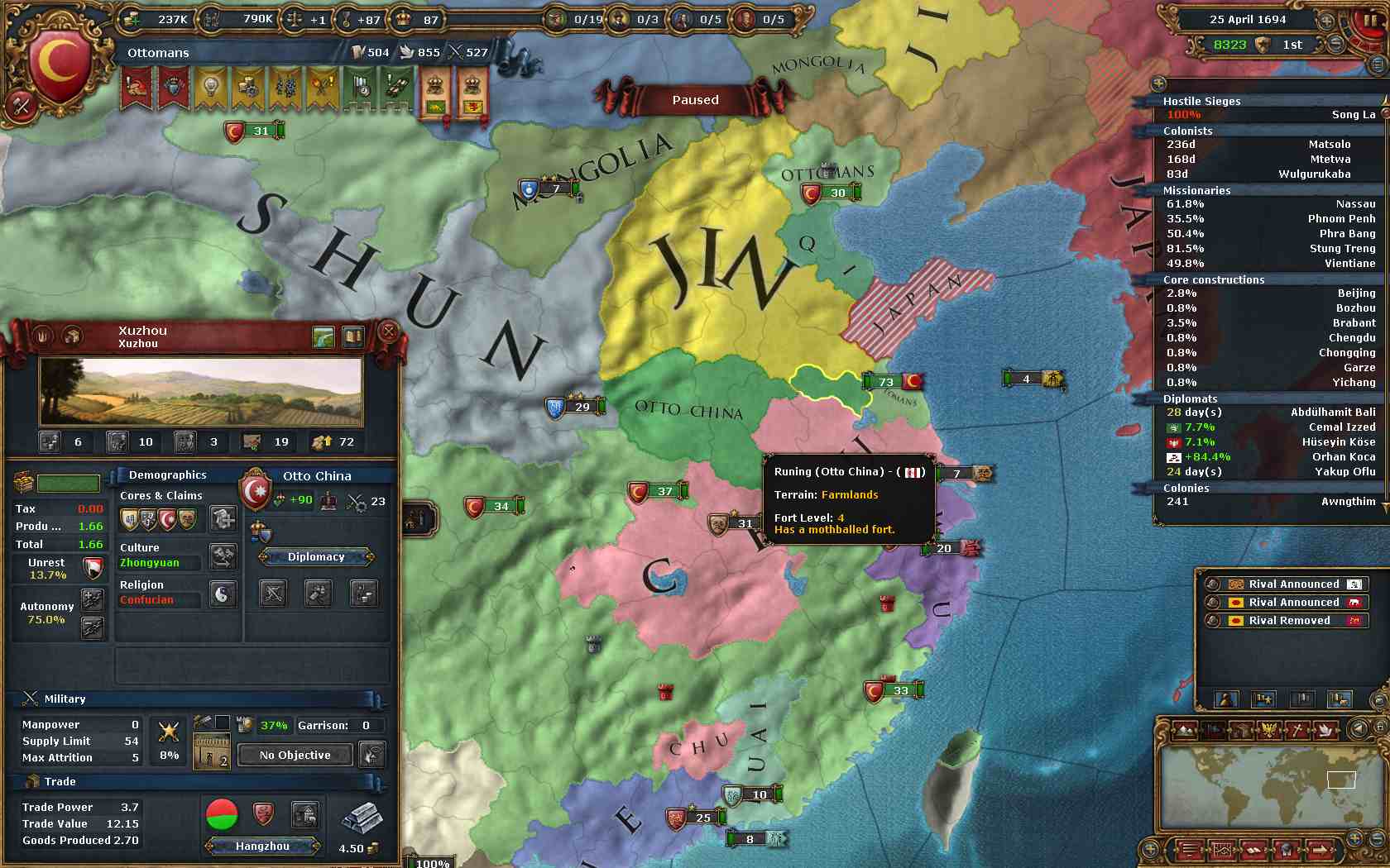 中国侵攻は順調に侵攻中。OEが100%超えています。