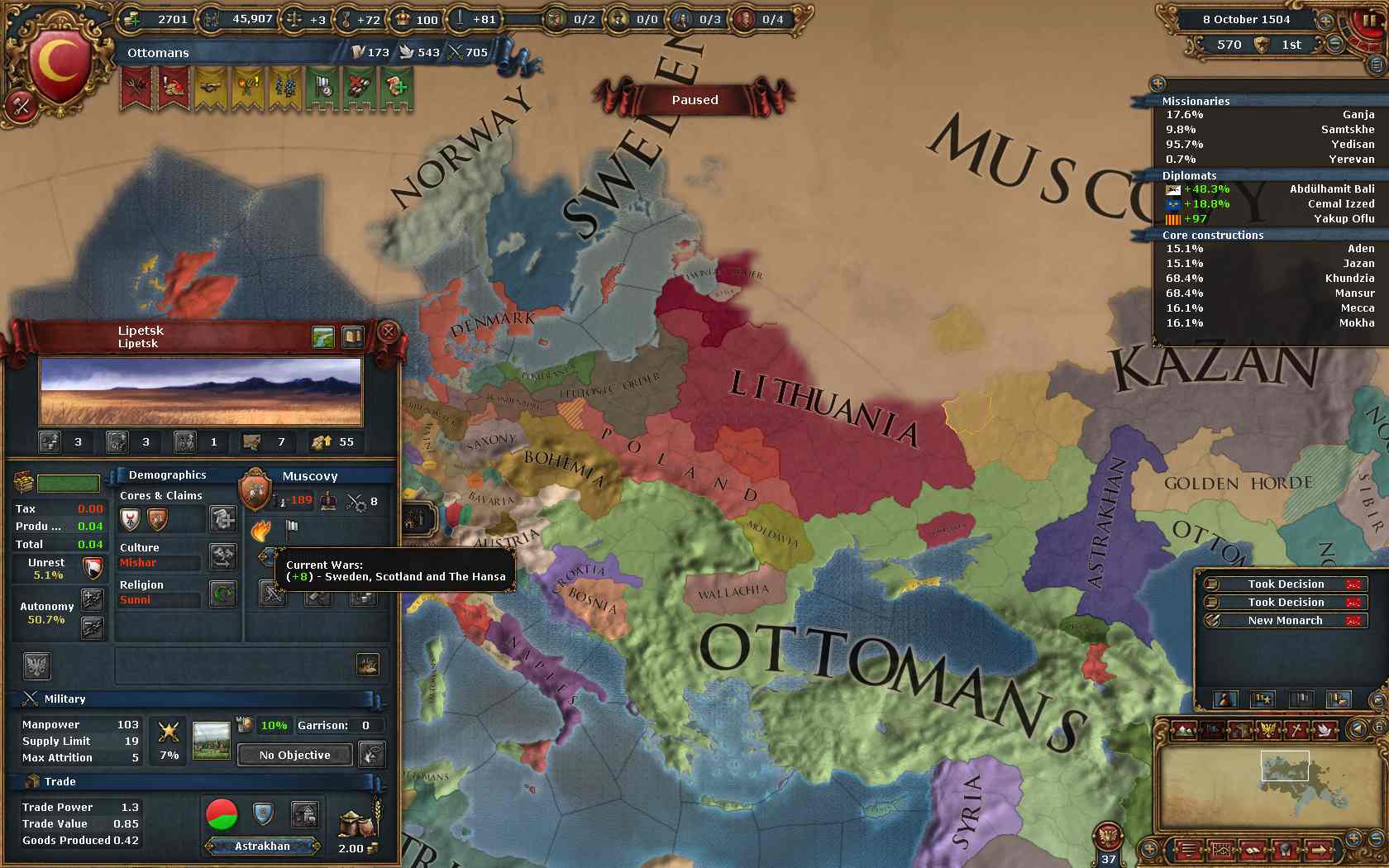 Muscovyが消耗してから攻めようと考え、その前に一つ戦争を挟むことにしました。