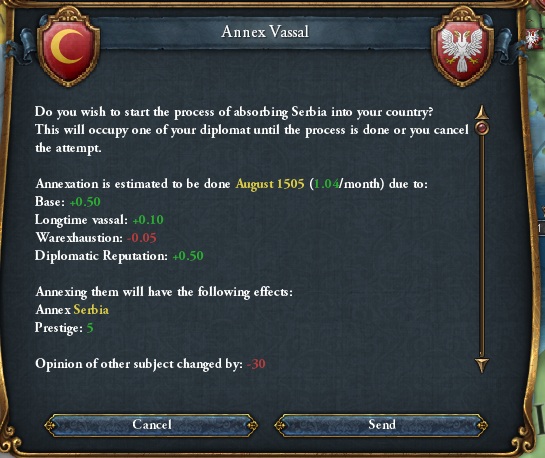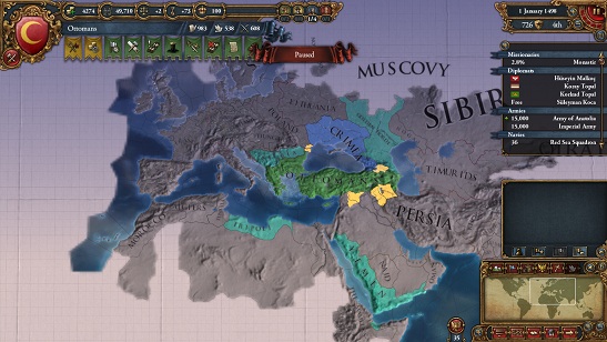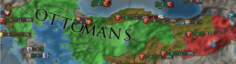 そう考え、トレビゾンドとアルメニア、セルビアとワラキアを攻めた。しかしセルビア、ワラキアと接しているハンガリーと今敵対するのは不味い。そう考えセルビアを傀儡化し、ワラキアの土地を支配させ、緩衝国として存続させた。