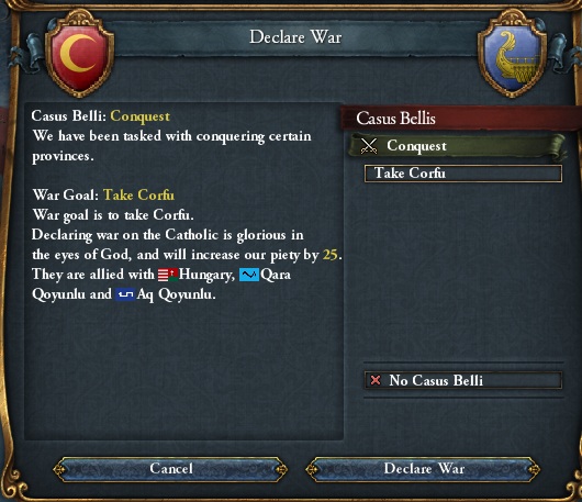 しかしメフメト2世はマムルーク朝だけ外交で解決し脱退させ、後の国は些事とし、ヴェネチアの支配から逃れていたコルフに侵攻した。