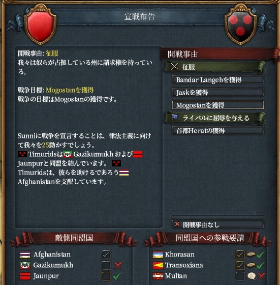 1472年、Timuridsとの停戦期間が明けたTransoxianaとKhorasanに土地の約束をして宣戦しました。相手同盟国のJaunpurが気になりますが、主戦場から離れているしTransoxianaが被害担当になってくれるはずなので大丈夫!