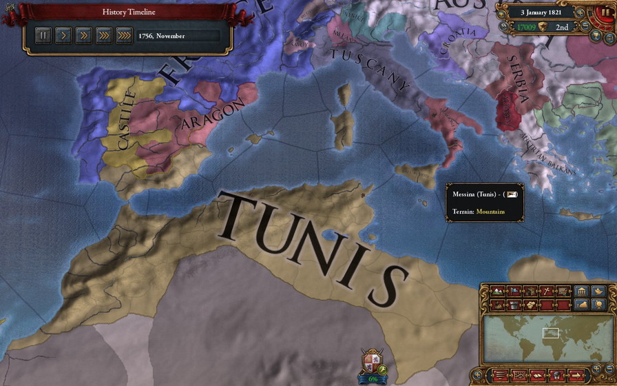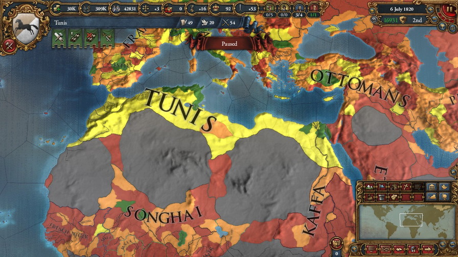 Tunisの北アフリカ領。ほぼ全てのプロヴィンスがDevelopment20を超える。(一つだけ勘違いが原因で超えてない)