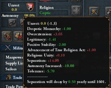 下の画像では、改宗により国教寛容度が適用されているため自治度増による補正と併せ、分離主義が大きく残っていてもて不穏度を押さえ込めていることがわかります。
