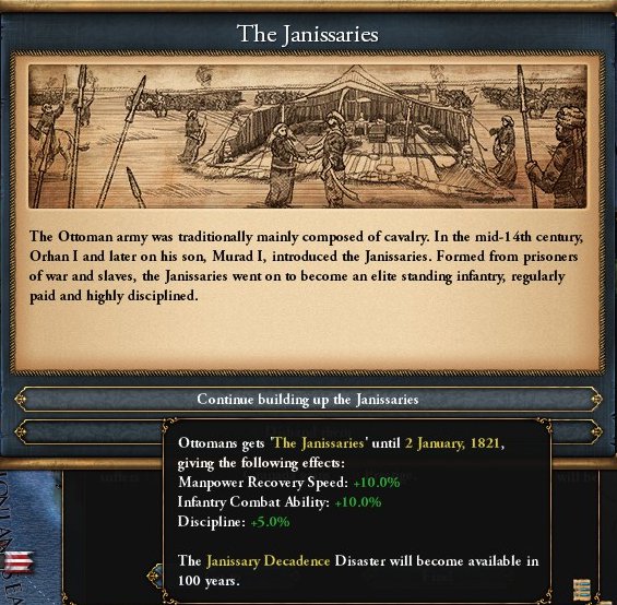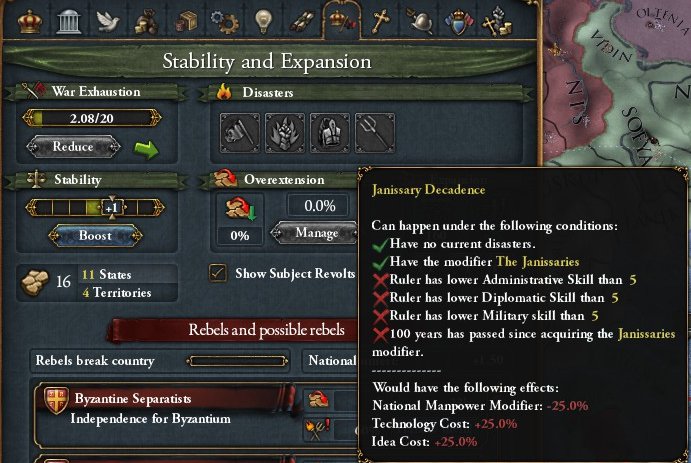 100年後以降(本プレイでは1559年2月以降)いずれの君主能力も5点に満たない君主が治めるときに絶大な不利が発生します(その後、この不利を取り除くためにイェニチェリ補正を失うことになります)。