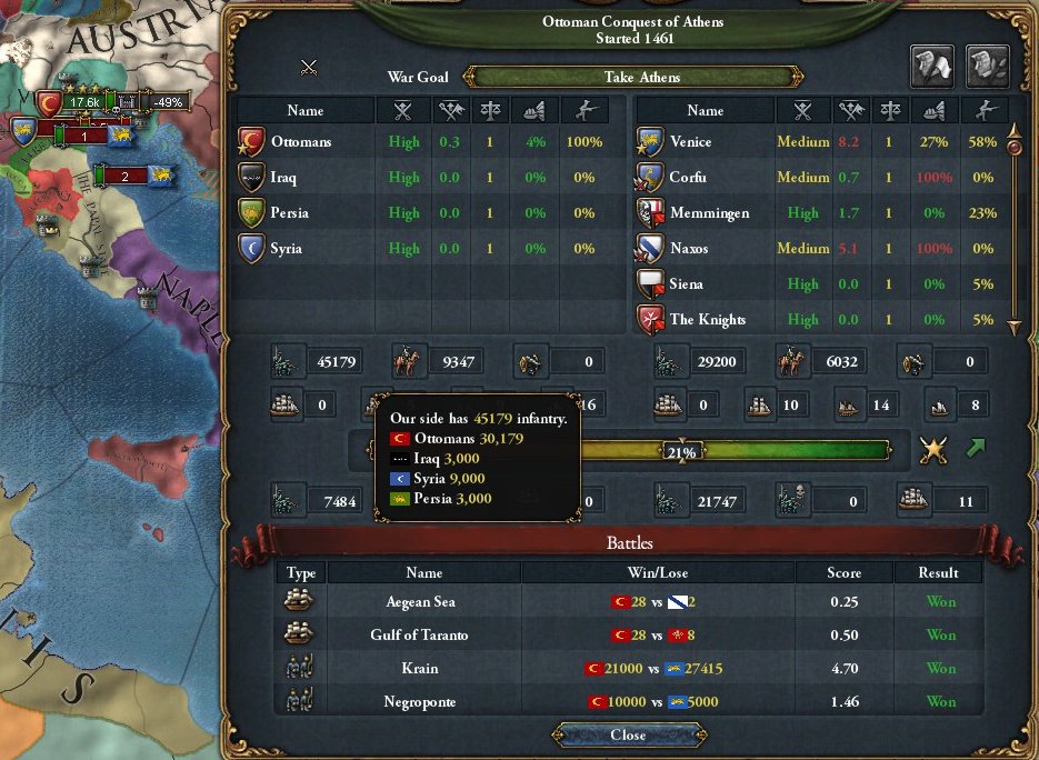 ヴェネツィアは属国のほか通商同盟 (Trade League) により弱小国家を従えていますが、陸軍の質が高くなく戦力が分散されているため、その他に強い同盟国がいなければオスマンにとって大した敵ではありません。