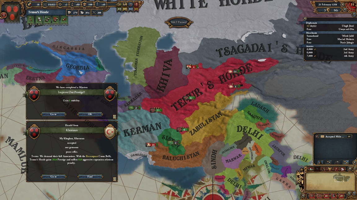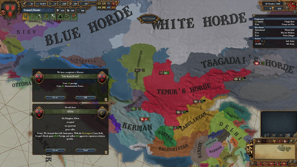 ミッションでヒヴァのプロビを獲得するやつを選択し、ヒヴァにReconquestのCBで宣戦布告。ザブリスタンが敵側で同盟参戦してきたが、なんのその、ホラサン戦と同じ要領でヒヴァを全土占領し、これを併合することによって強制的に戦争を終わらせた。1360年のことである。