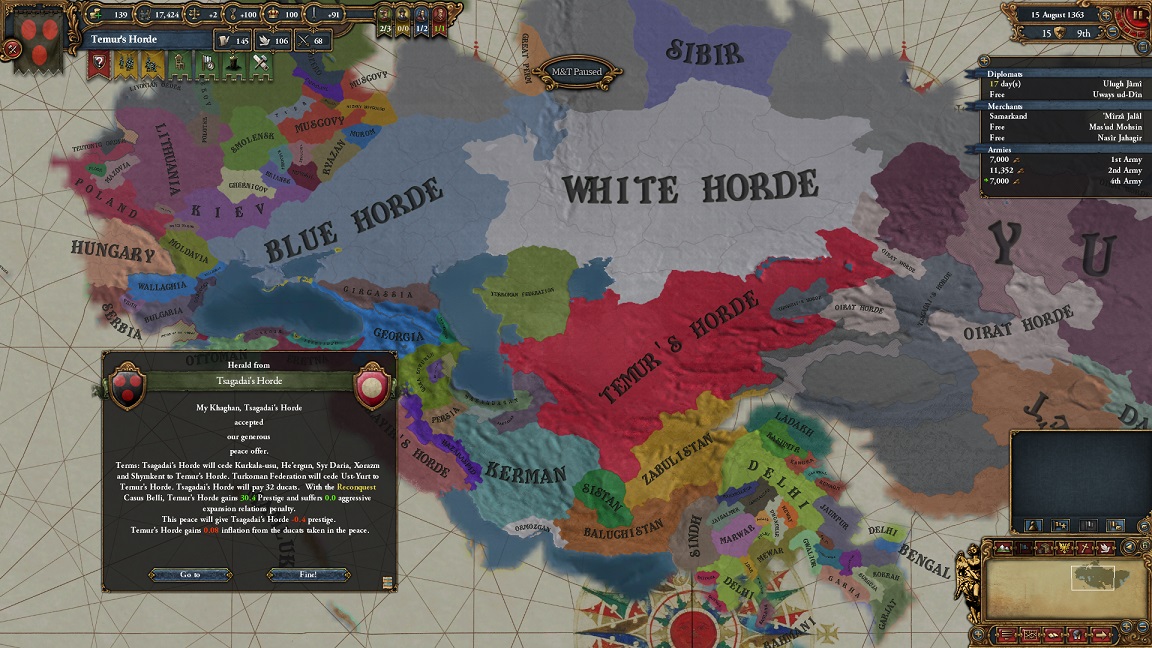 占領地を拡げ、トルコマン連合からコア州を、チャガタイ・オルドからは首都と、反乱軍によって占領されたいちプロビを除くすべてのコア州を割譲させた。