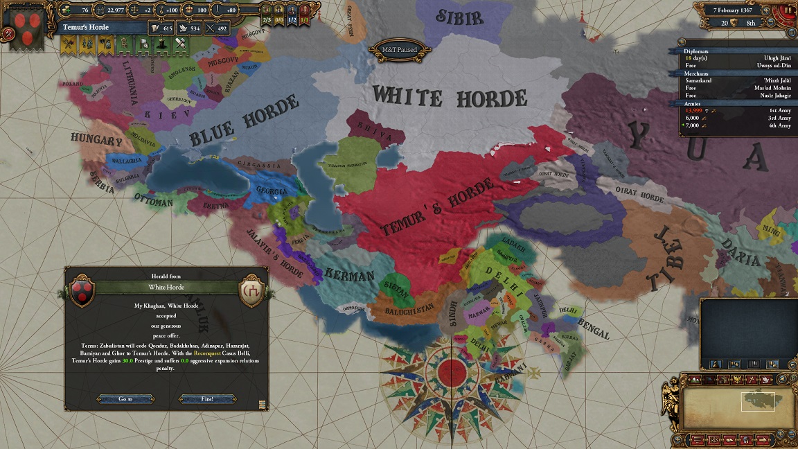 しかし彼らはホワイト・オルドと同盟を結んでいたため、釣りだし戦略でホワイト・オルドに宣戦。実際はティムールの軍隊は南下してザブリスタンの全土を占領し、首都以外のコア州をすべて回収することに成功した。1367年2月のことである。