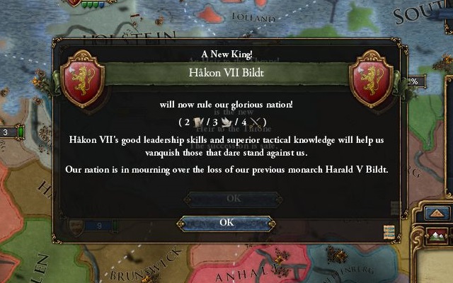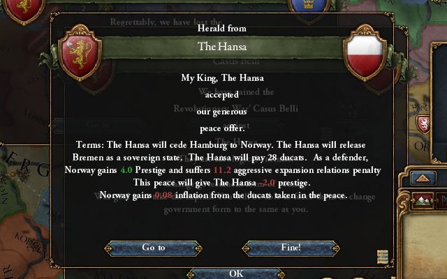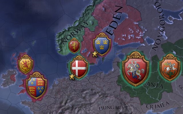今気付いたのだが、ユトランド北端を奪って飛び石形式でオスロまでHREを引っ張ってくれば、200ADM払って遷都する必要は無かったんじゃなかろうか。