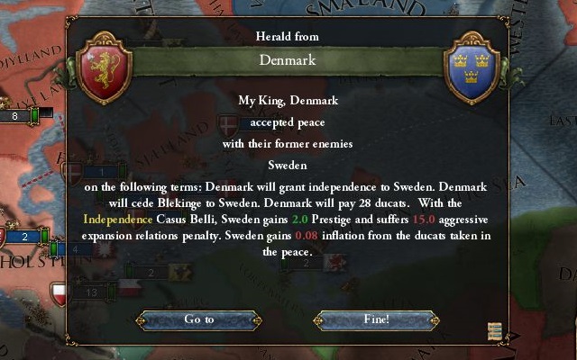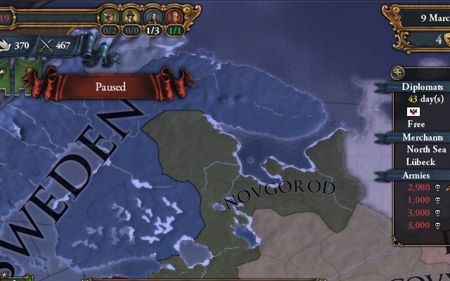 1494年8月 台帳でスウェーデンが陸海軍共に半壊状態なのを確認し、ヴェステルイェートランド征服CBで宣戦布告。モスクワも参戦。