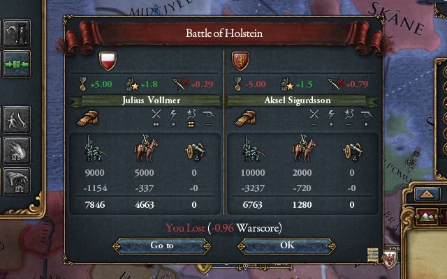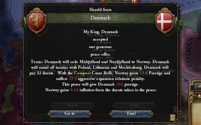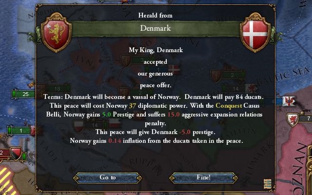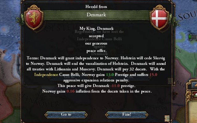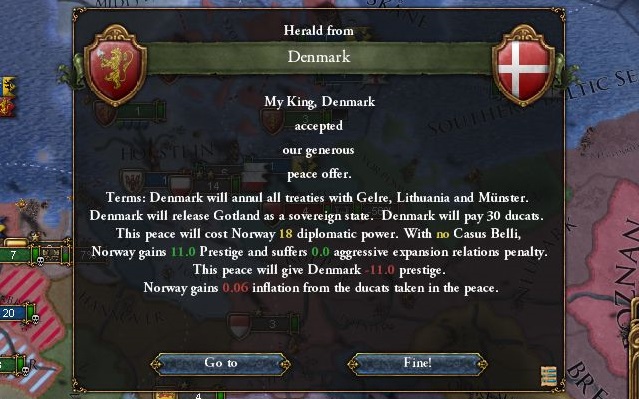 他にホルシュタインの属国関係解除、リトアニア、モスクワとの関係断絶、小額の賠償金を受け取って講和成立。休戦期間が過ぎ次第ホルシュタインは食いに行く心算。