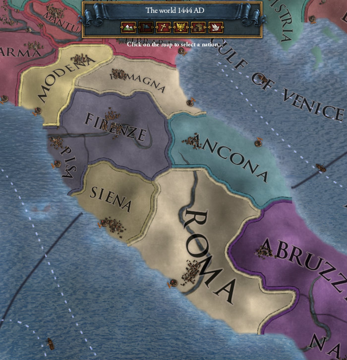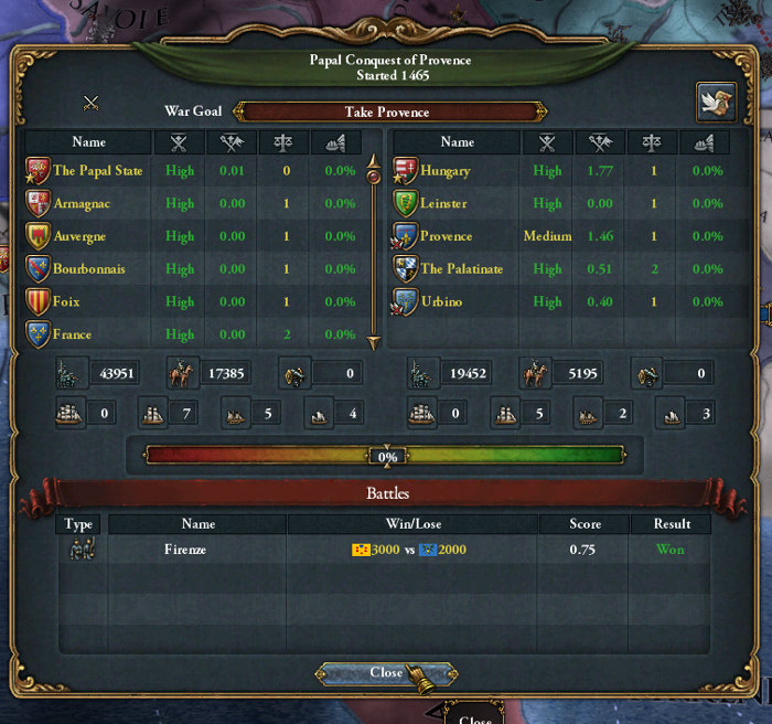 属国化を狙うも必要戦勝点が100点越えしてたので断念、Parma割譲で講和。