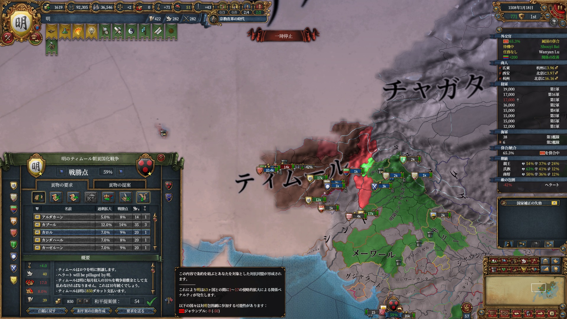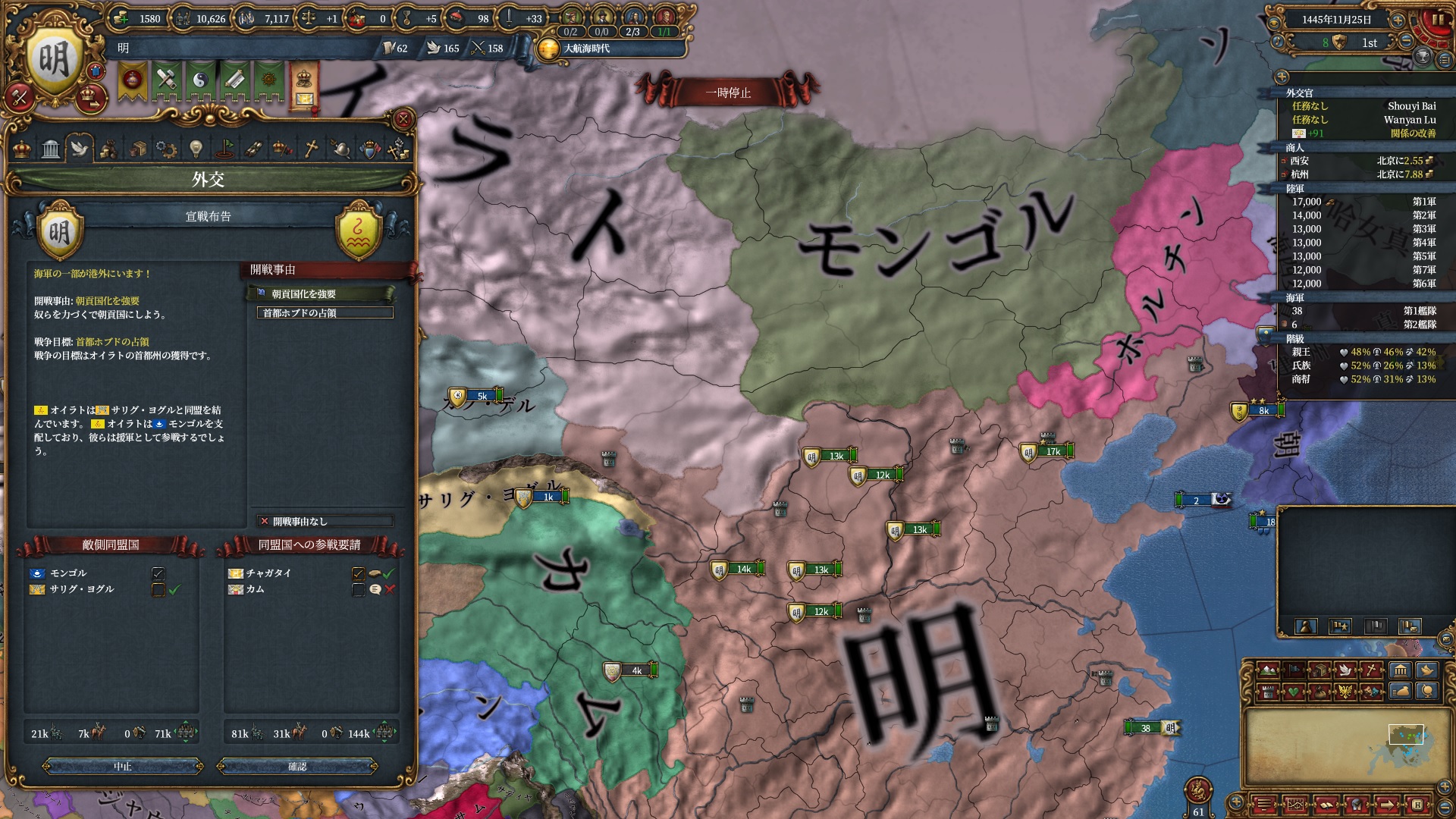 カムは外交属国化してインドへの足掛かり用、チャガダイは初手オイラト戦用です。