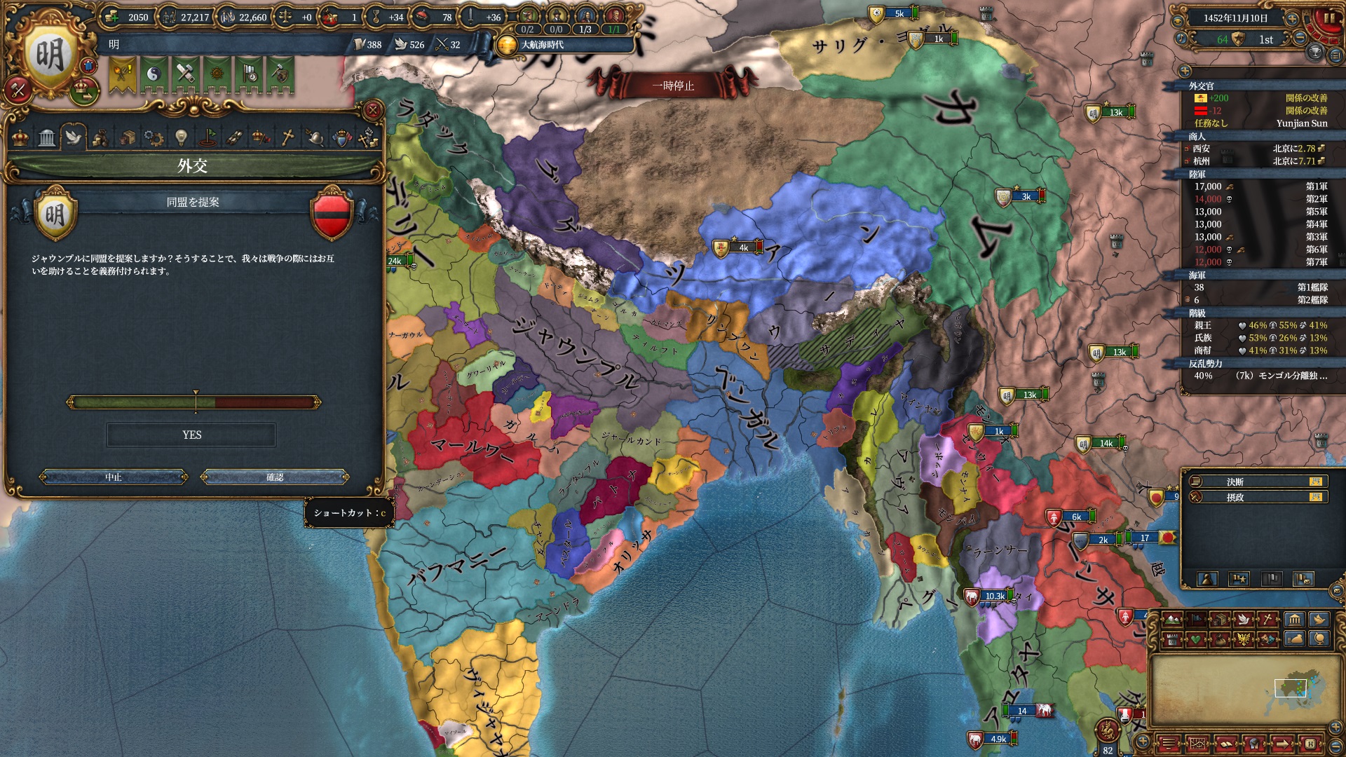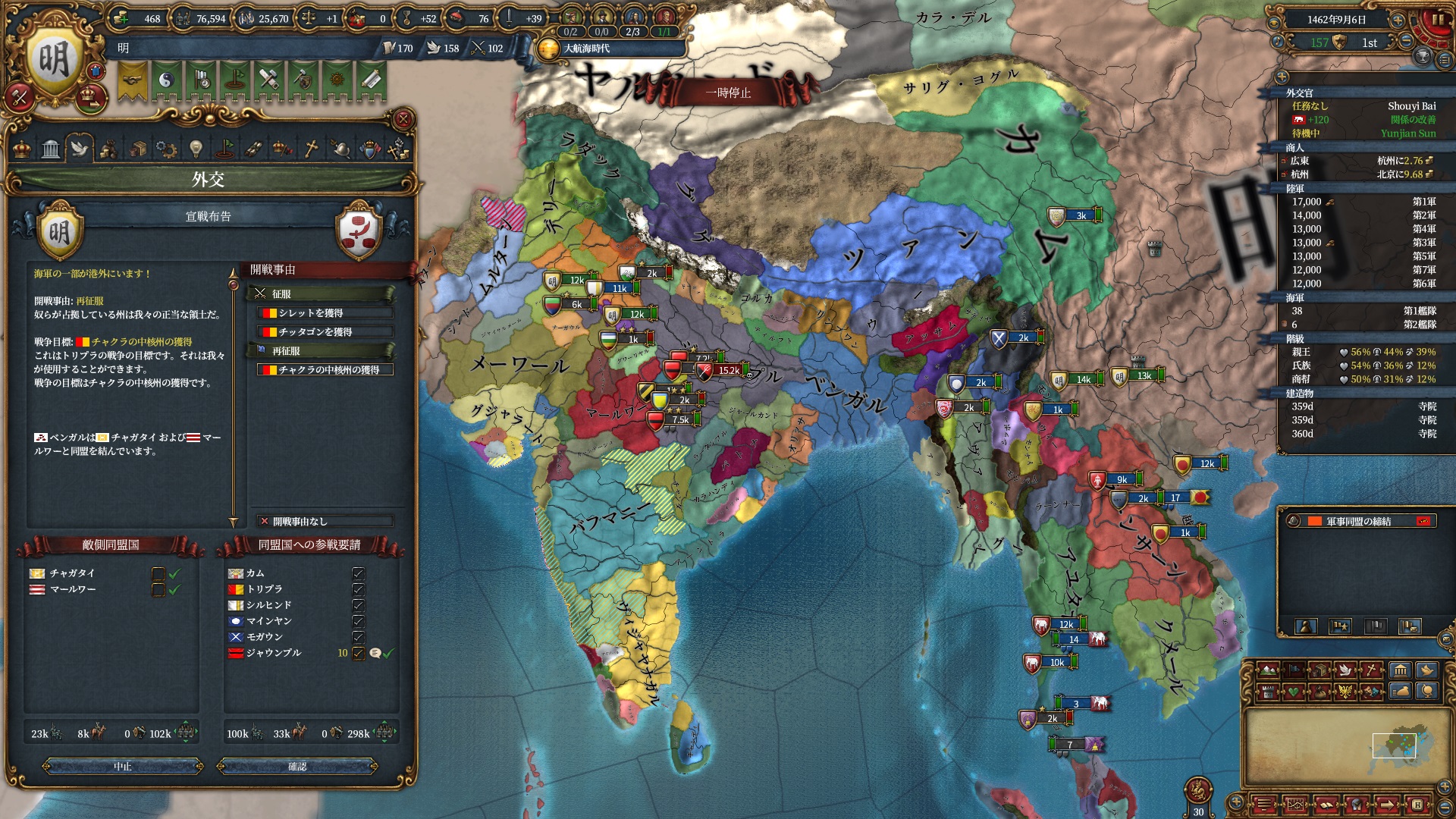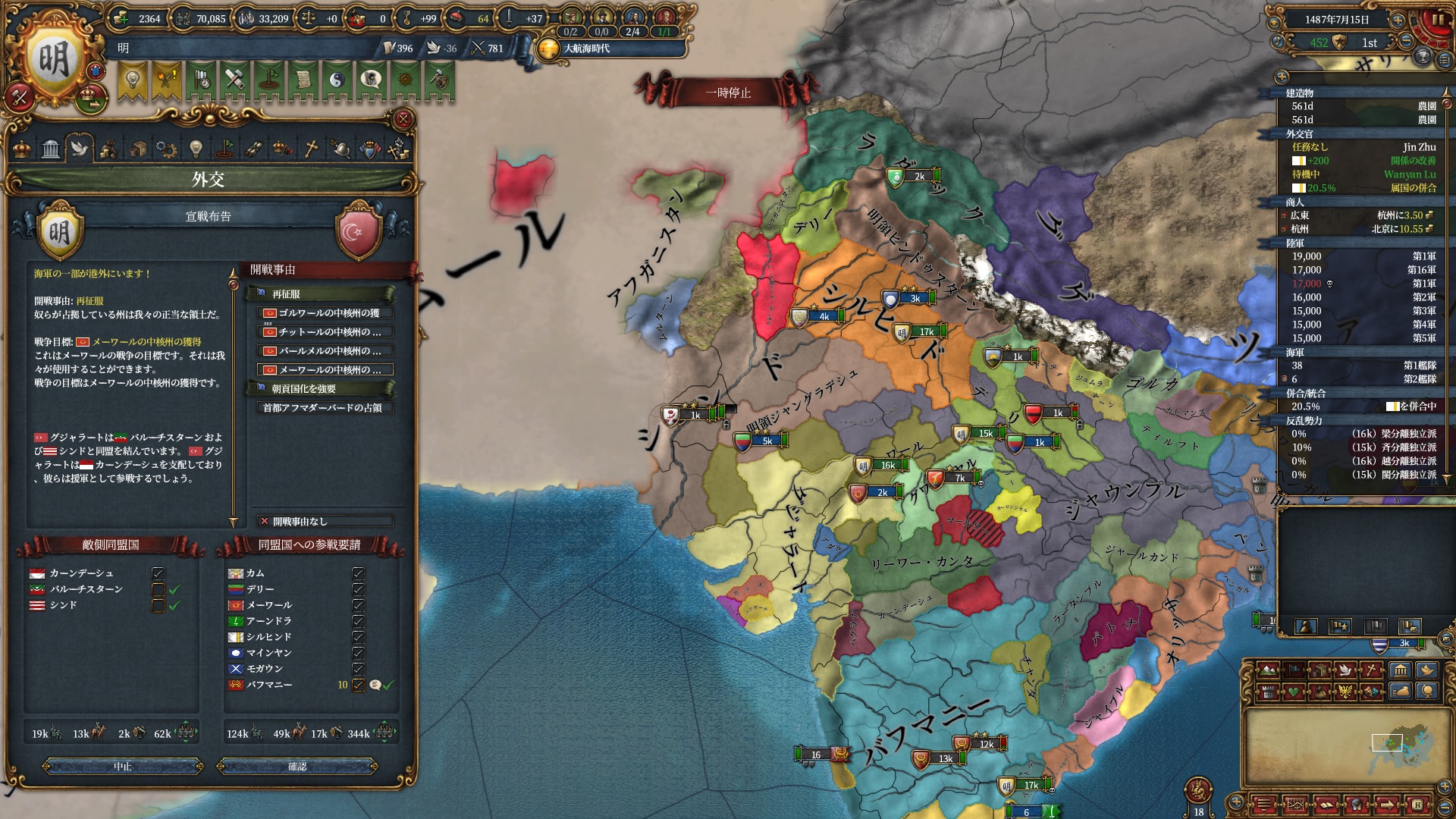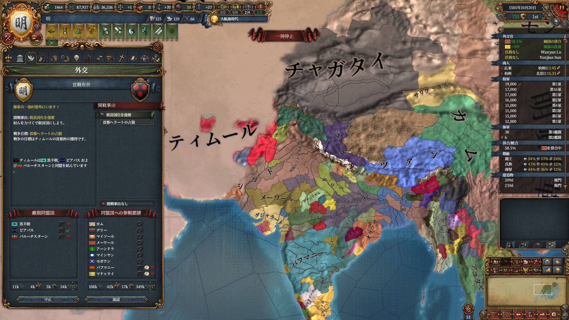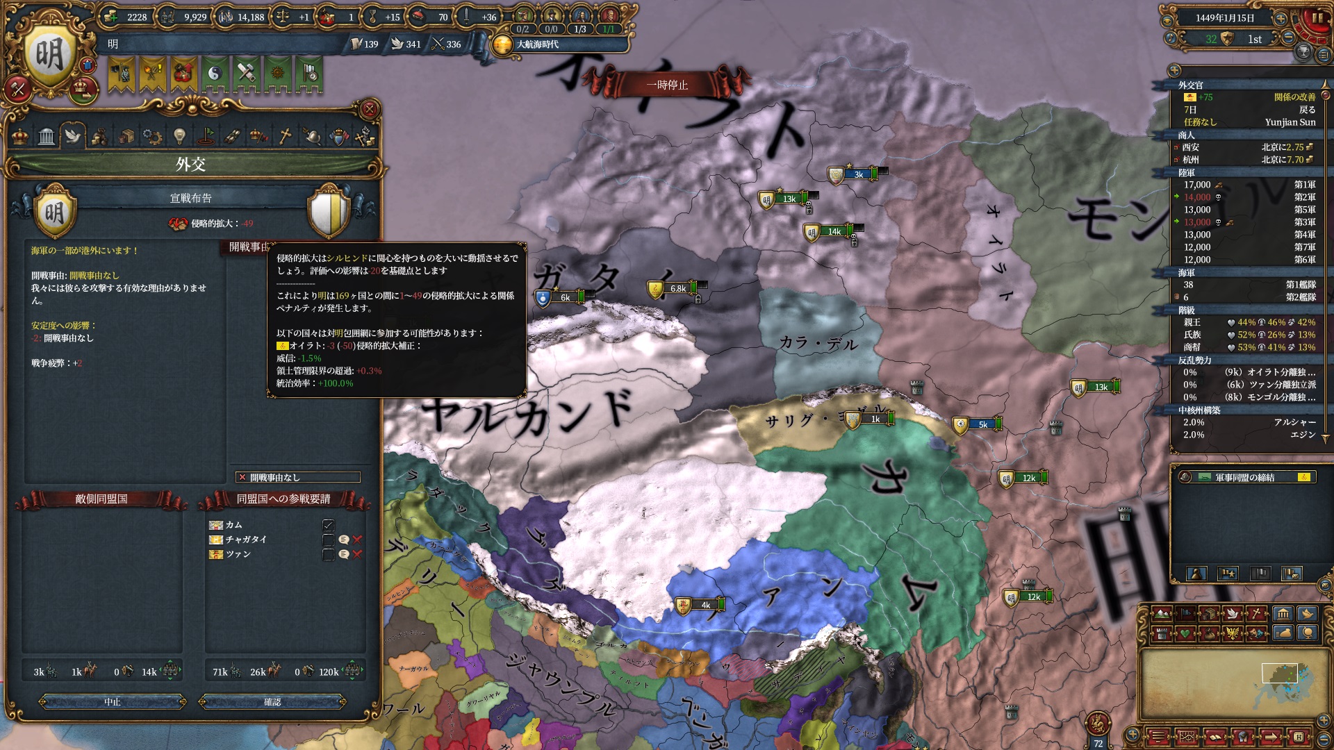 まだ儒教なので改宗面は腐っていますが、調和を碌にしていないため儒教のまま聖戦CBを仕掛ける事ができます。