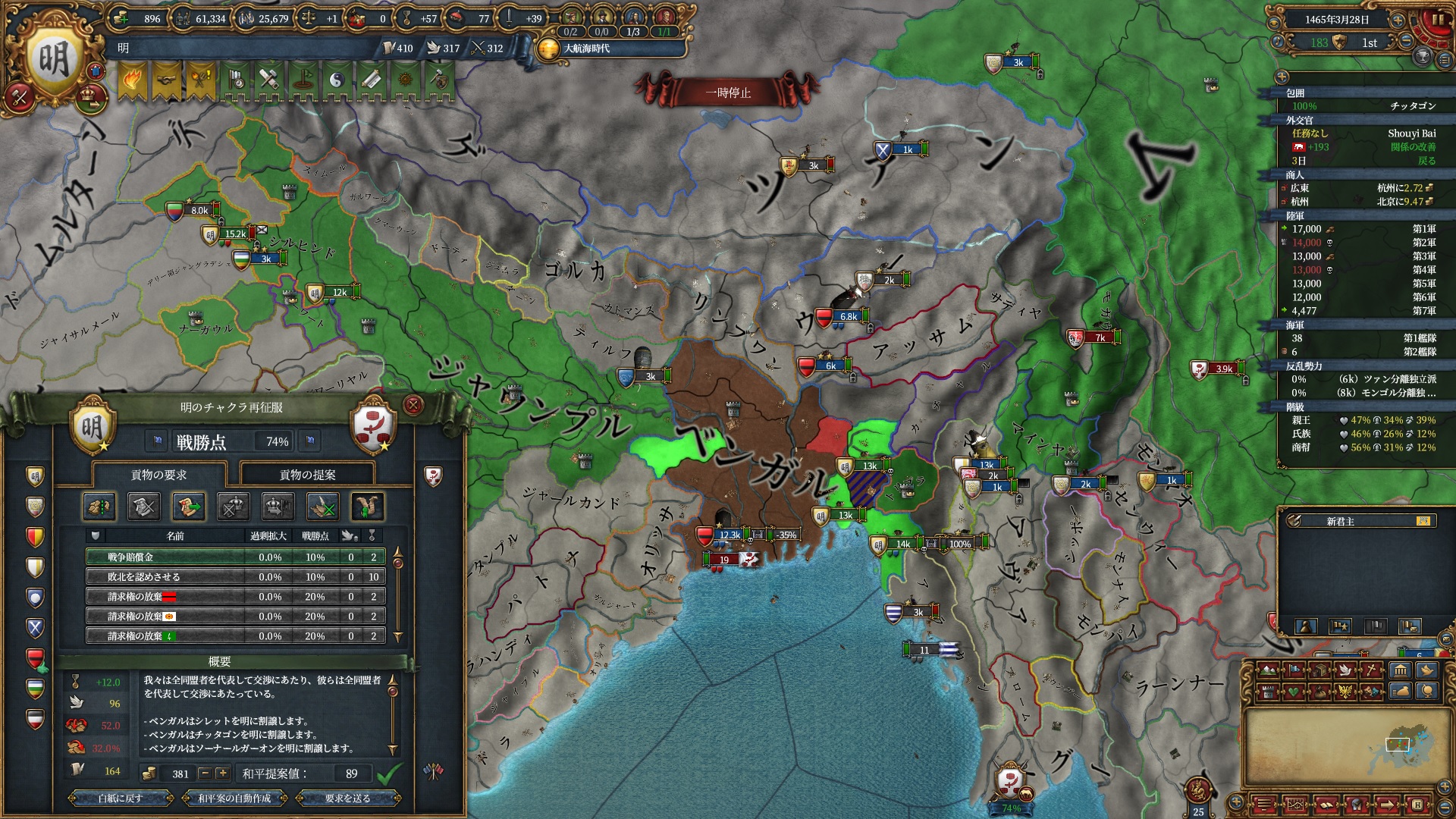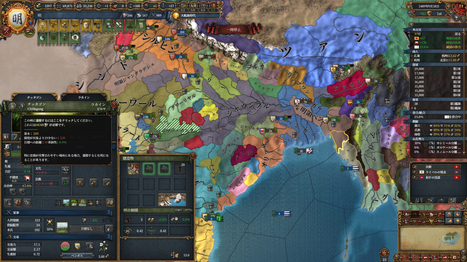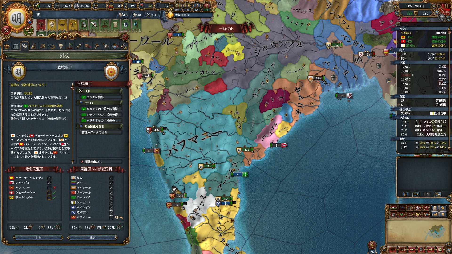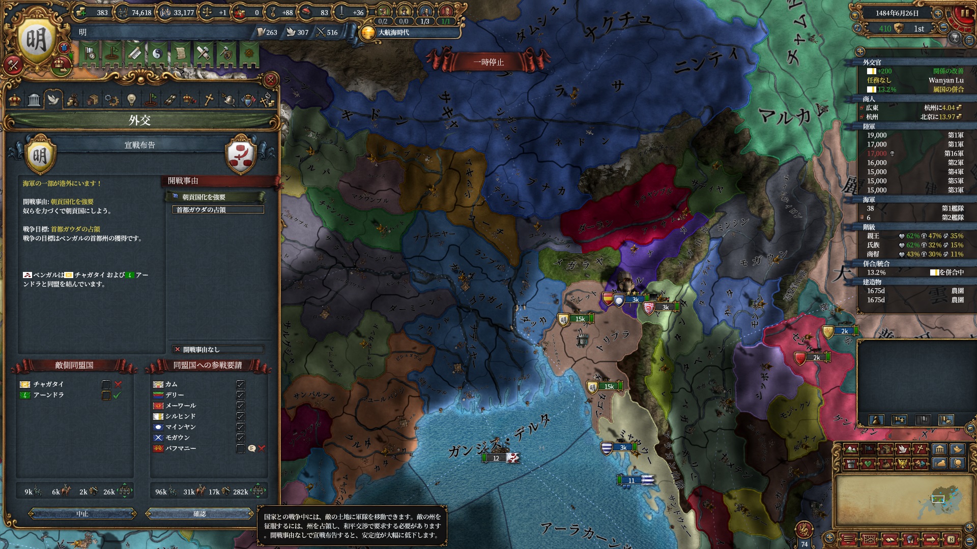 属国コアに隣接している州はコア化出来るようになるので一気にベンガル湾を制圧にかかります。