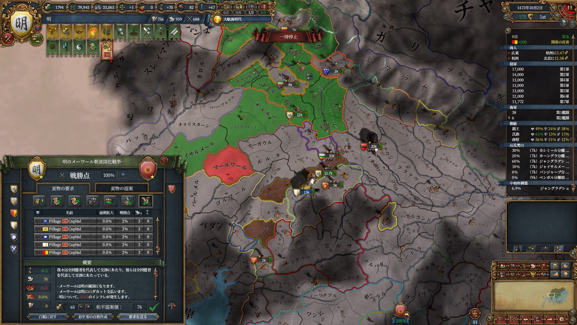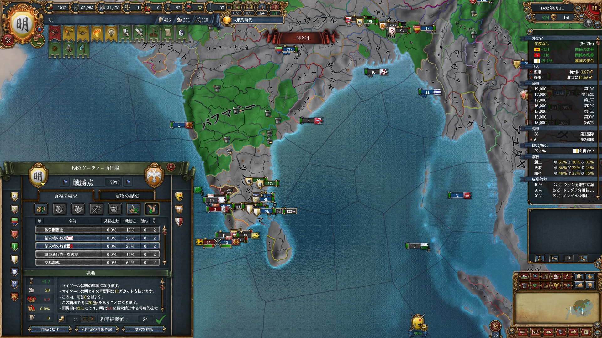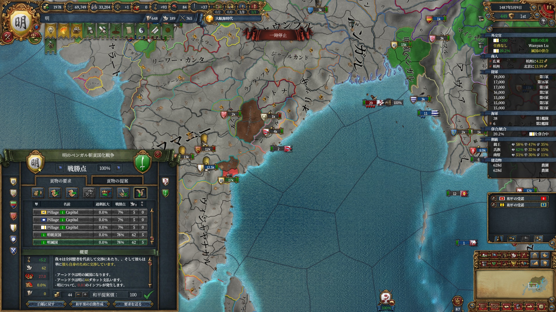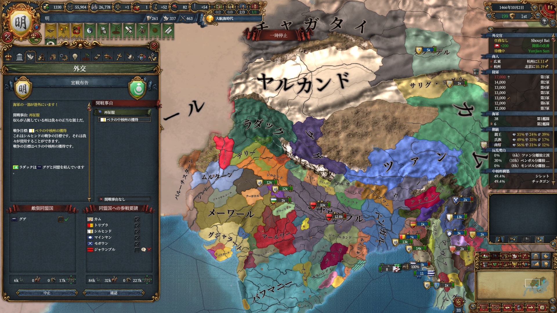 属国コアに隣接している州はコア化出来るようになるので一気にベンガル湾を制圧にかかります。
