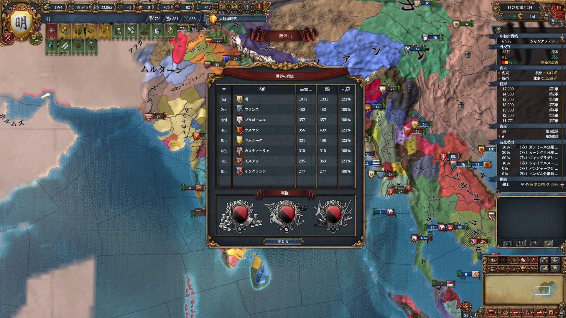 欧州は全く見えないので実態は分かりませんが、列強スコア的にはフランス・ブルゴーニュのスタートダッシュが決まっておりオスマンも滑り出しは順調といった感じです。