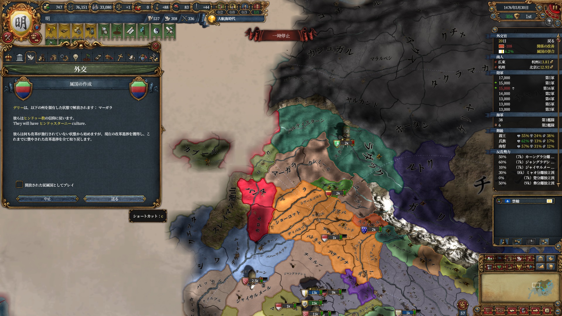 ラダック戦で獲得していたマーガラから属国デリーを作成します。