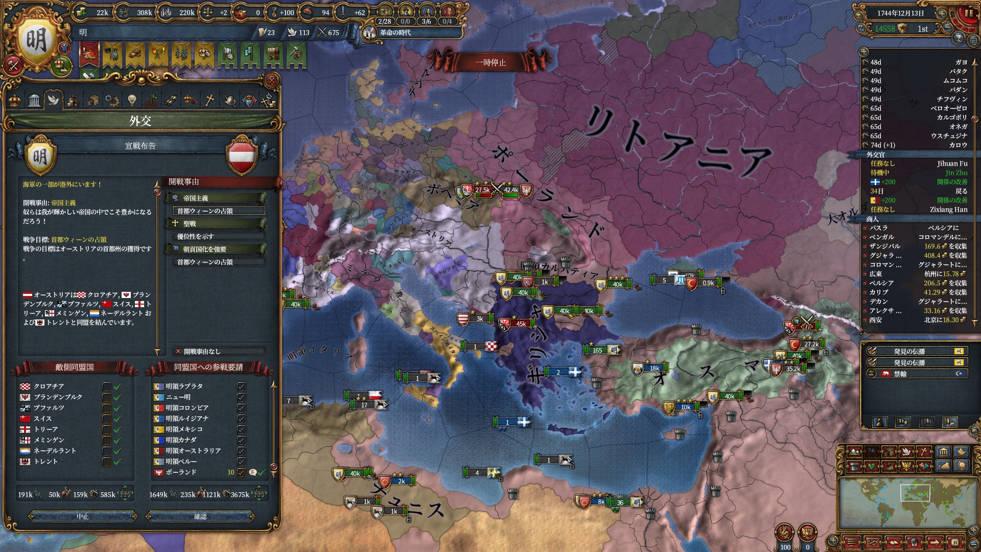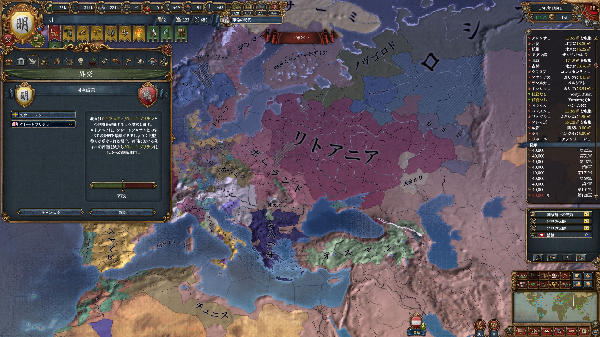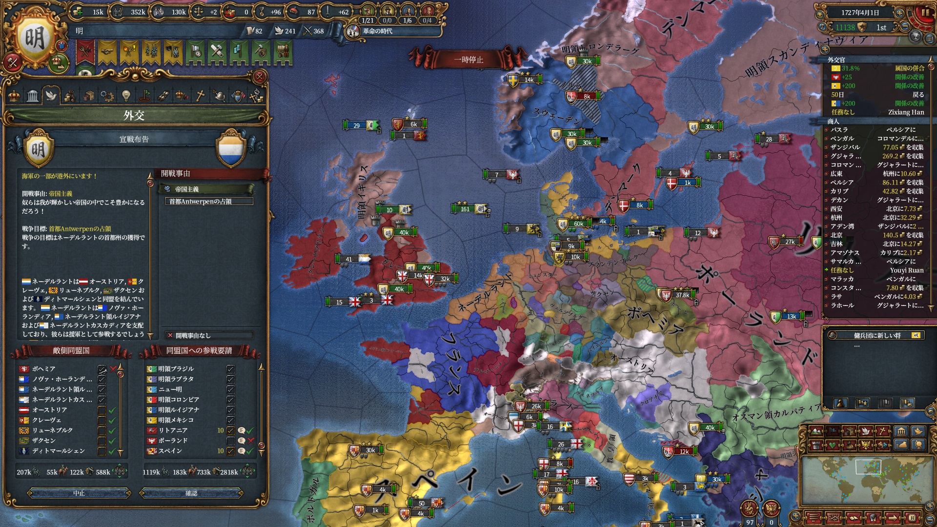 同盟国達はTrustが100に張り付いているのもあって為暫くは同盟のままでいてくれますが、そのうちAEのマイナスでopinionが+を維持できなくなり同盟強勢破棄となる為いけるところまで使い倒します。