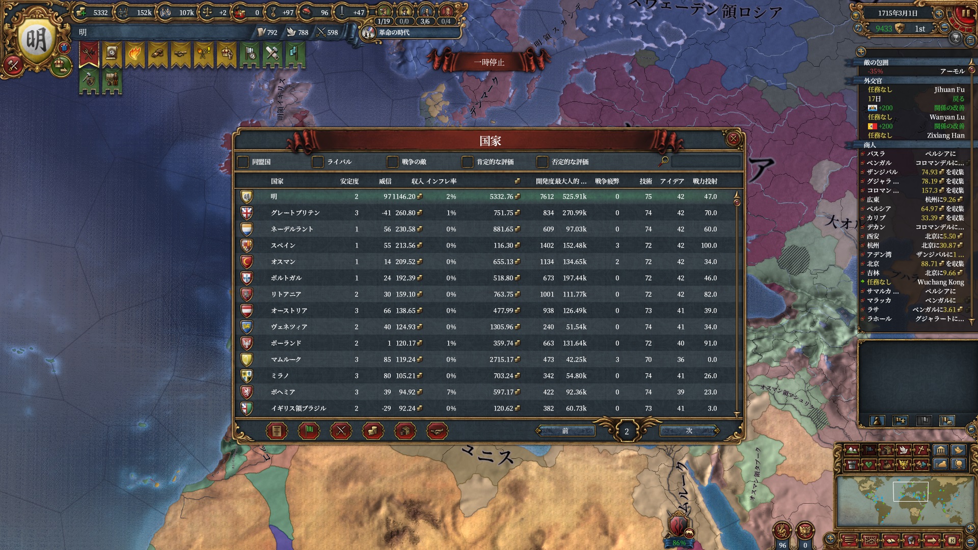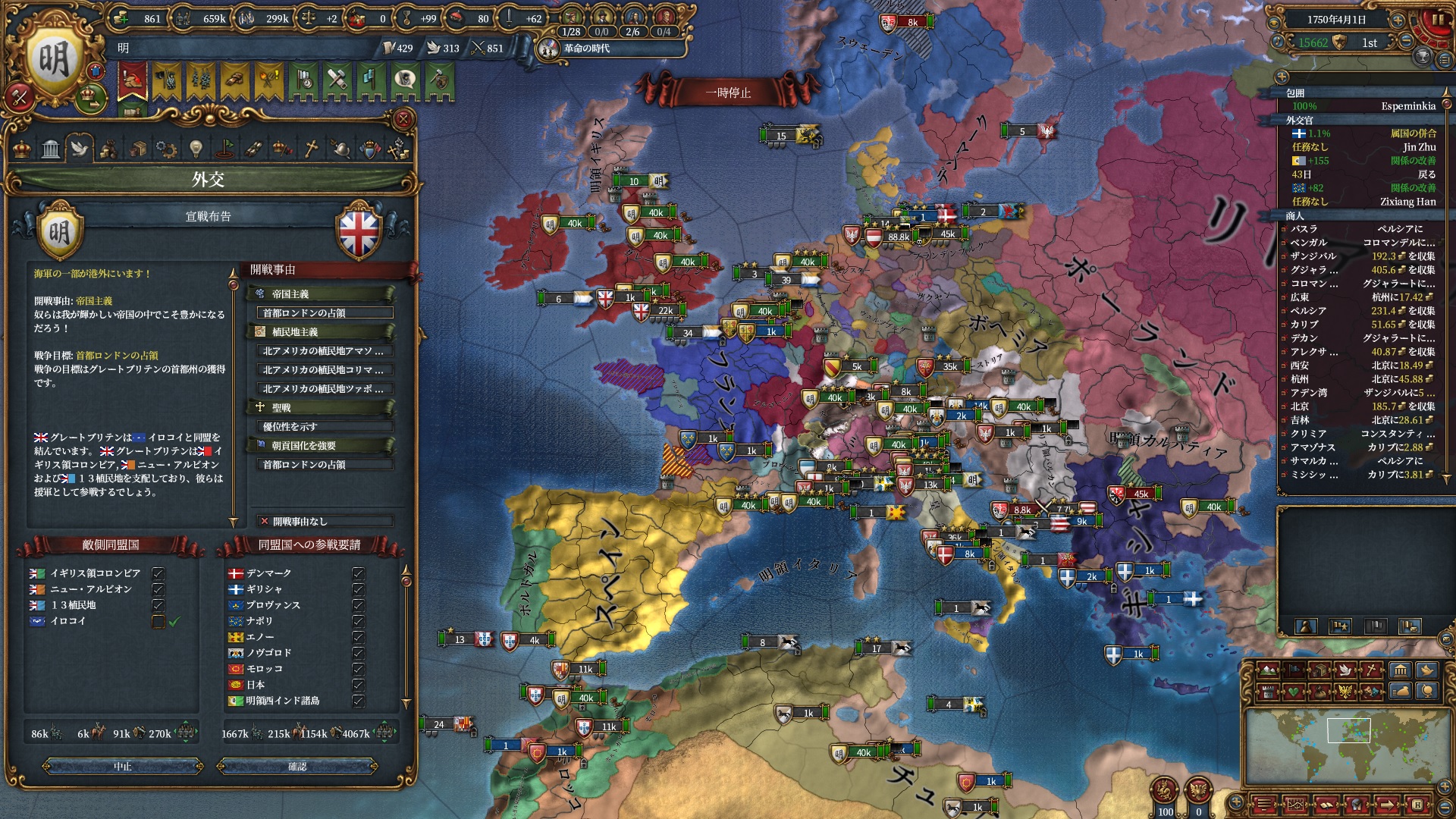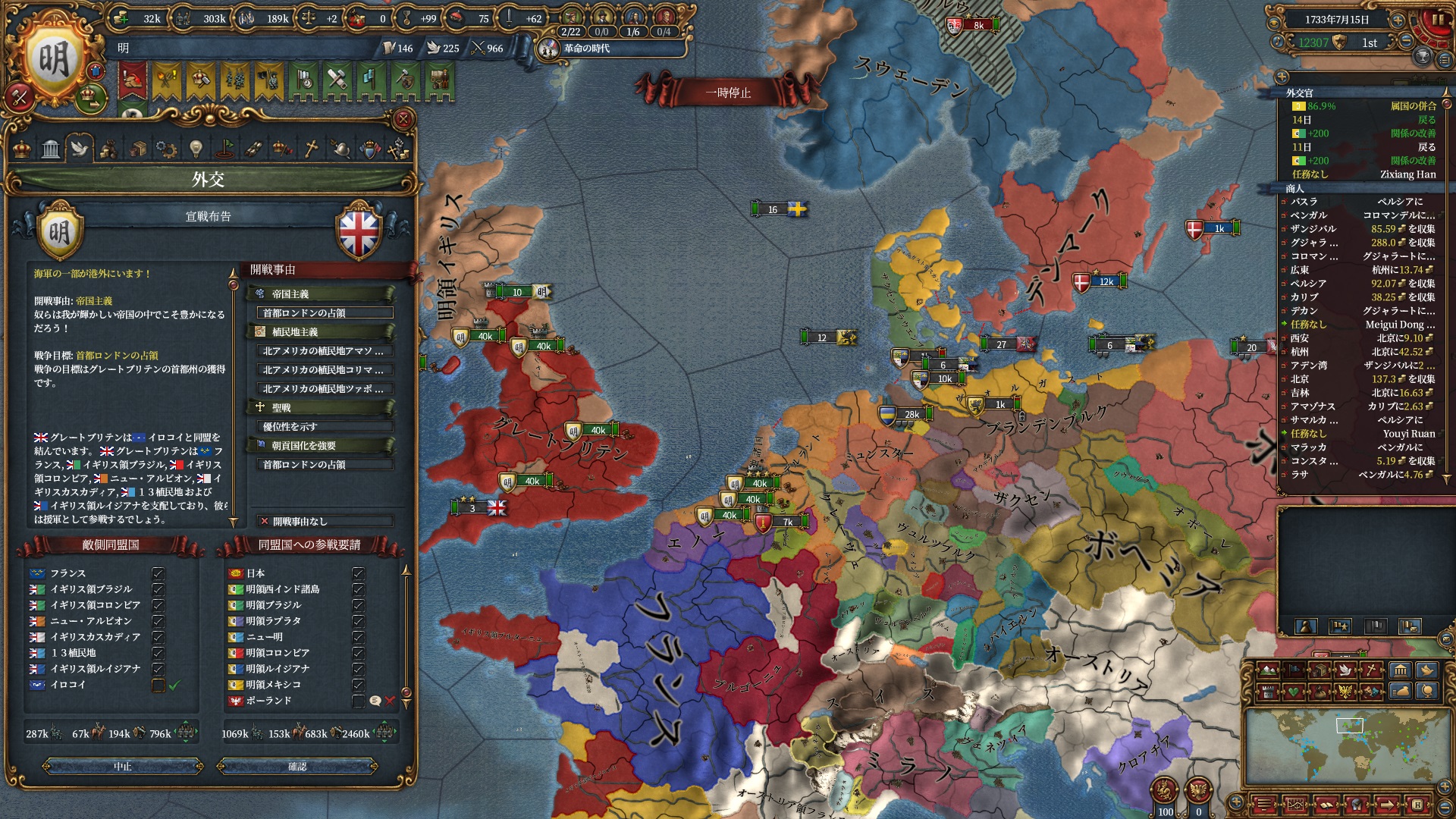同盟国達はTrustが100に張り付いているのもあって為暫くは同盟のままでいてくれますが、そのうちAEのマイナスでopinionが+を維持できなくなり同盟強勢破棄となる為いけるところまで使い倒します。