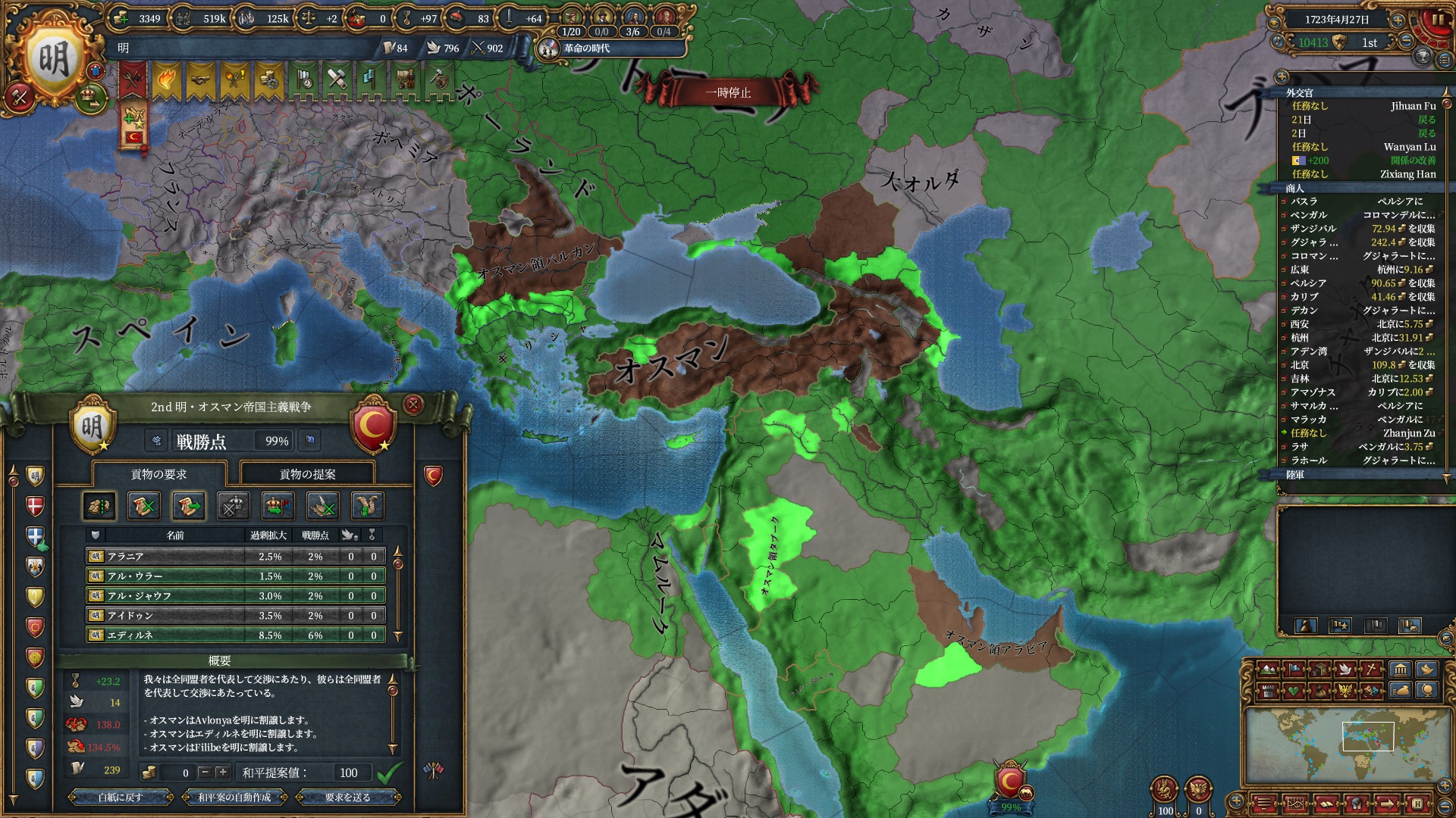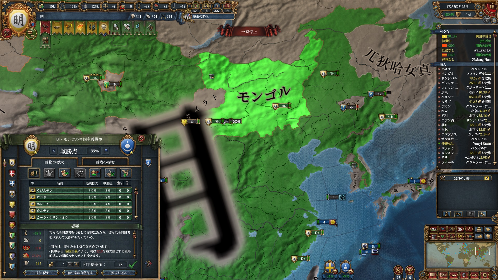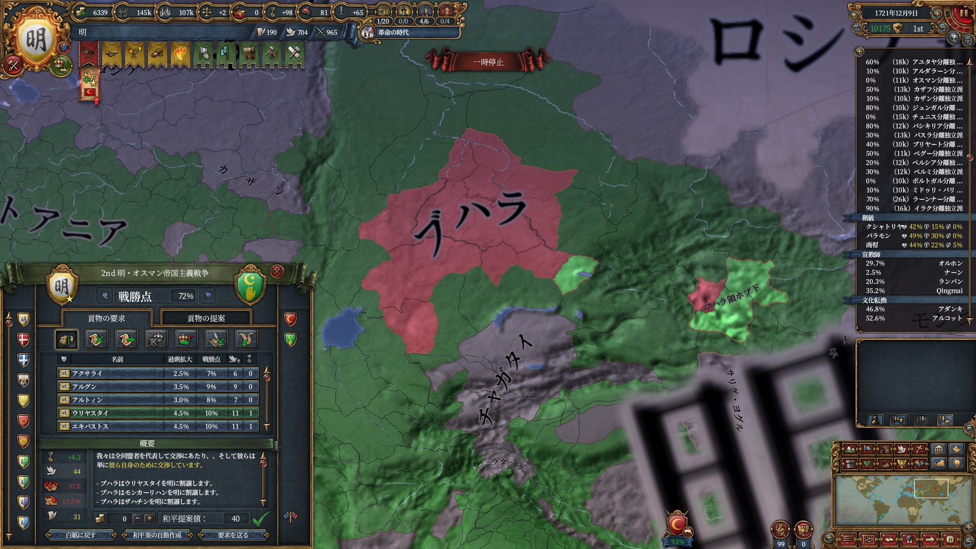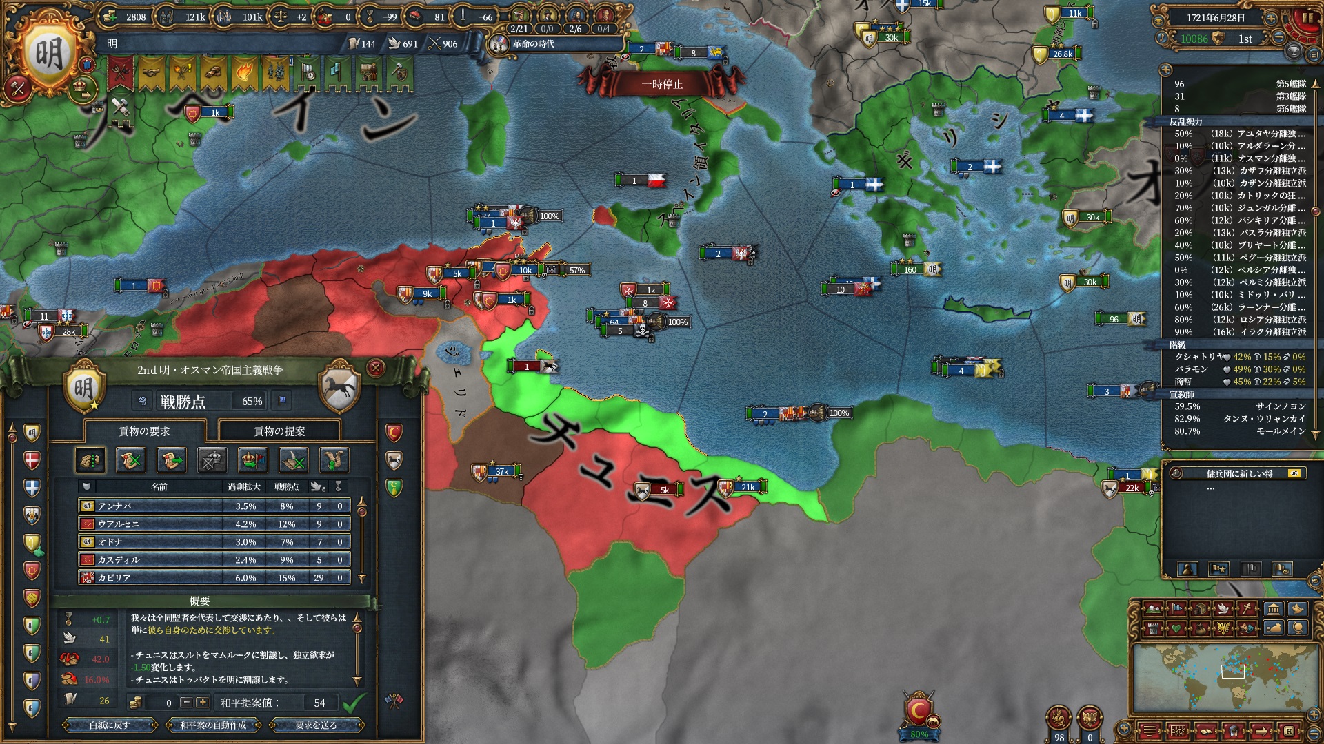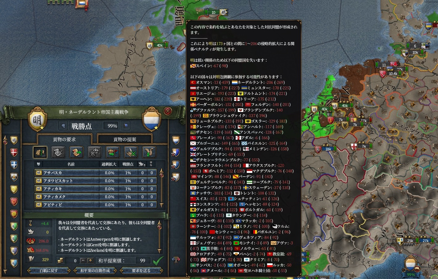 全州取得に必要な戦勝点は100を超えていますが帝国主義CBで75%の領地割譲と組み合わせれば(AEは無視するとして)属国に出来そうです。