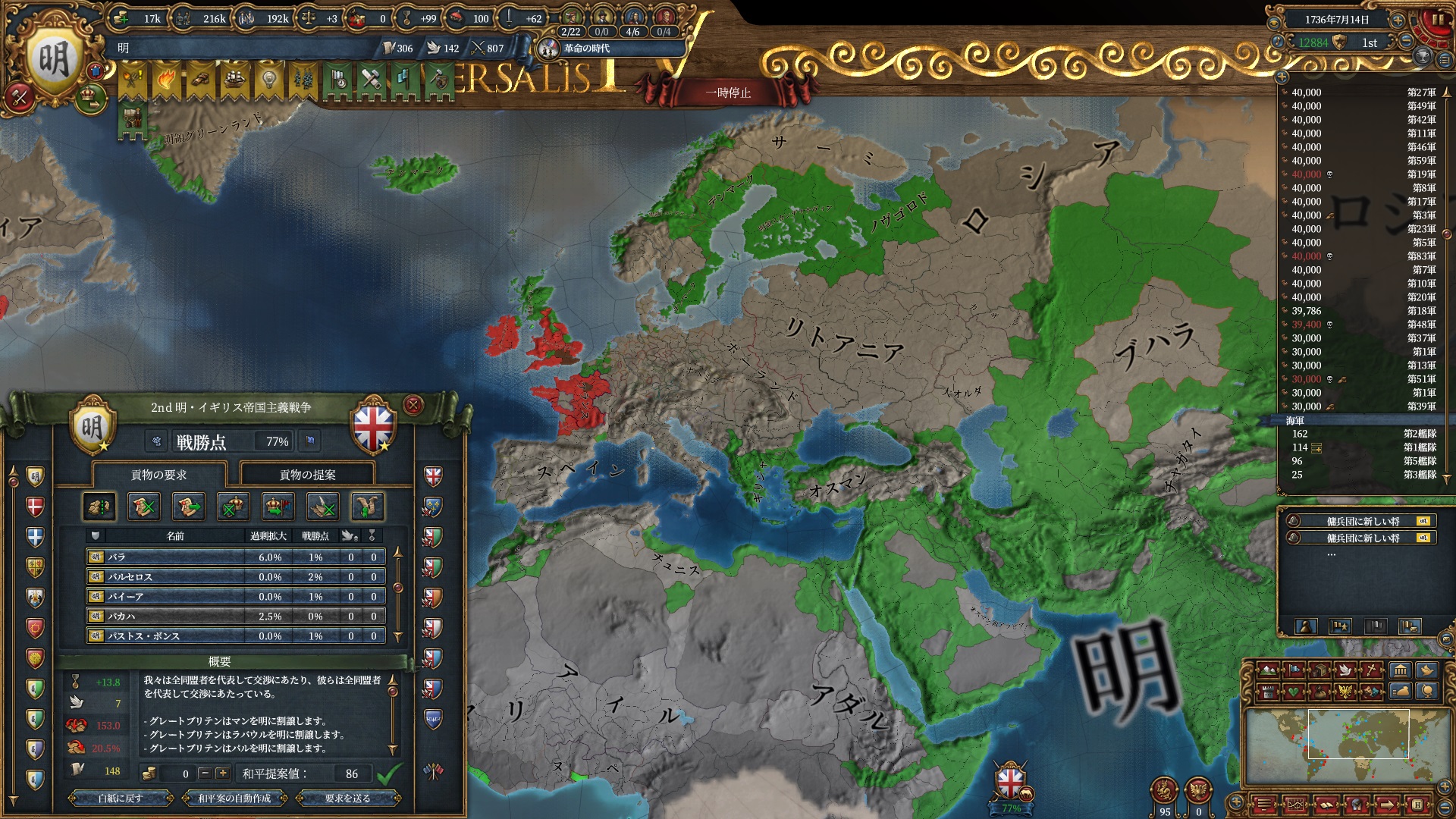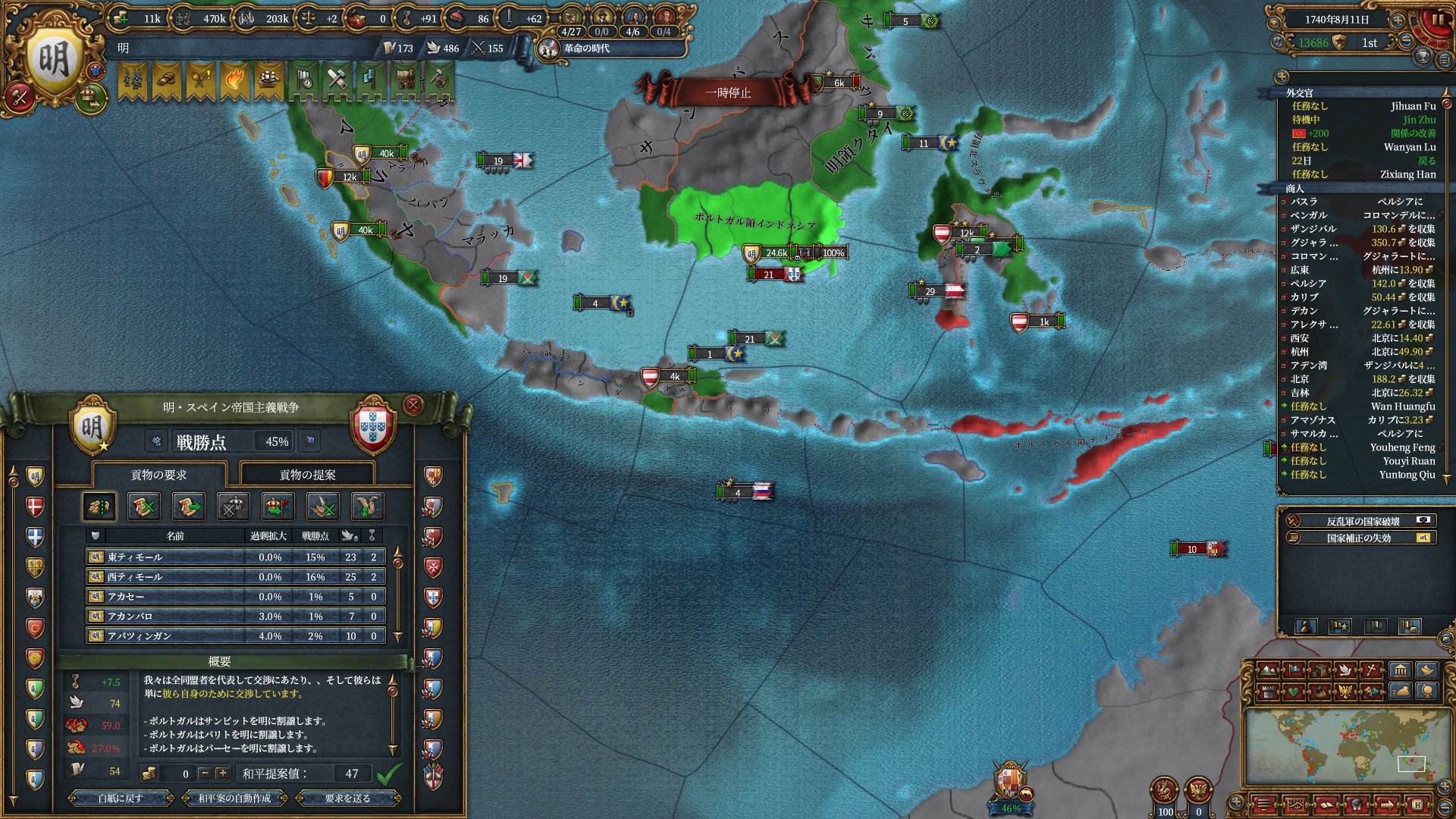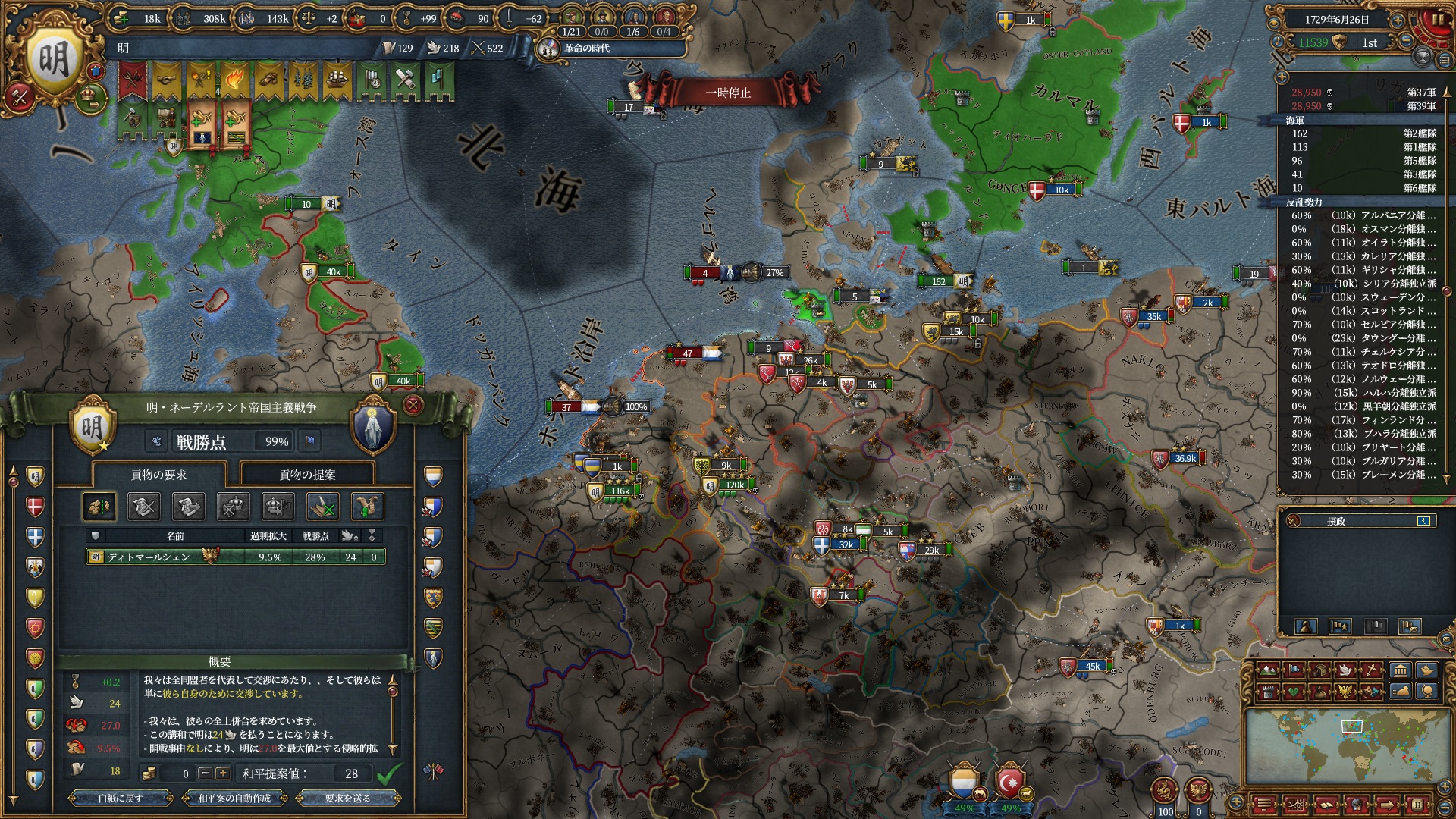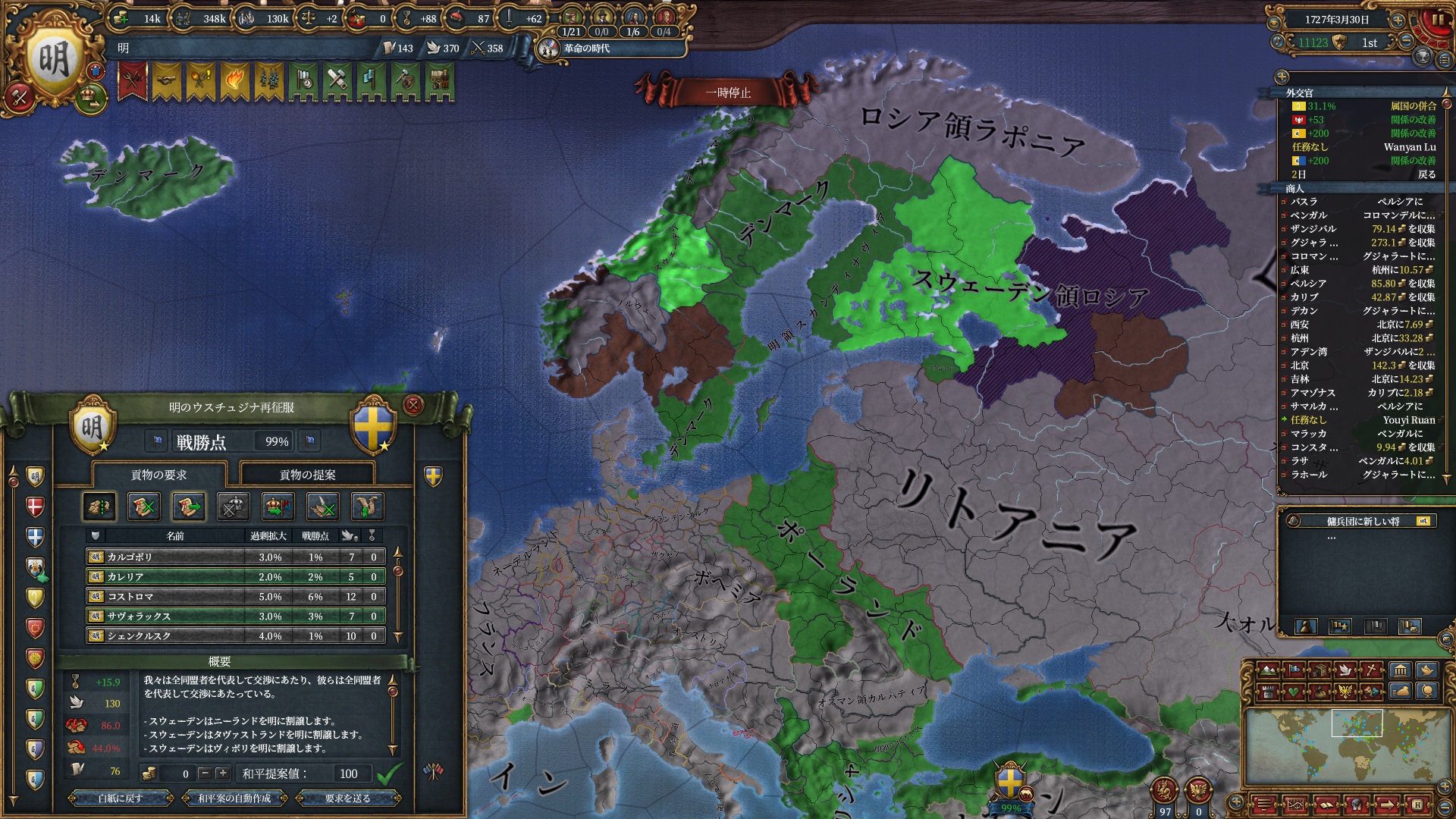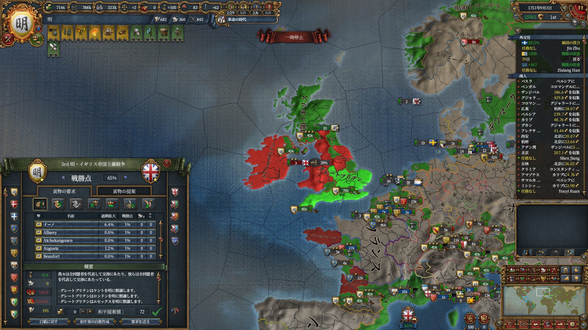 全州取得に必要な戦勝点は100を超えていますが帝国主義CBで75%の領地割譲と組み合わせれば(AEは無視するとして)属国に出来そうです。