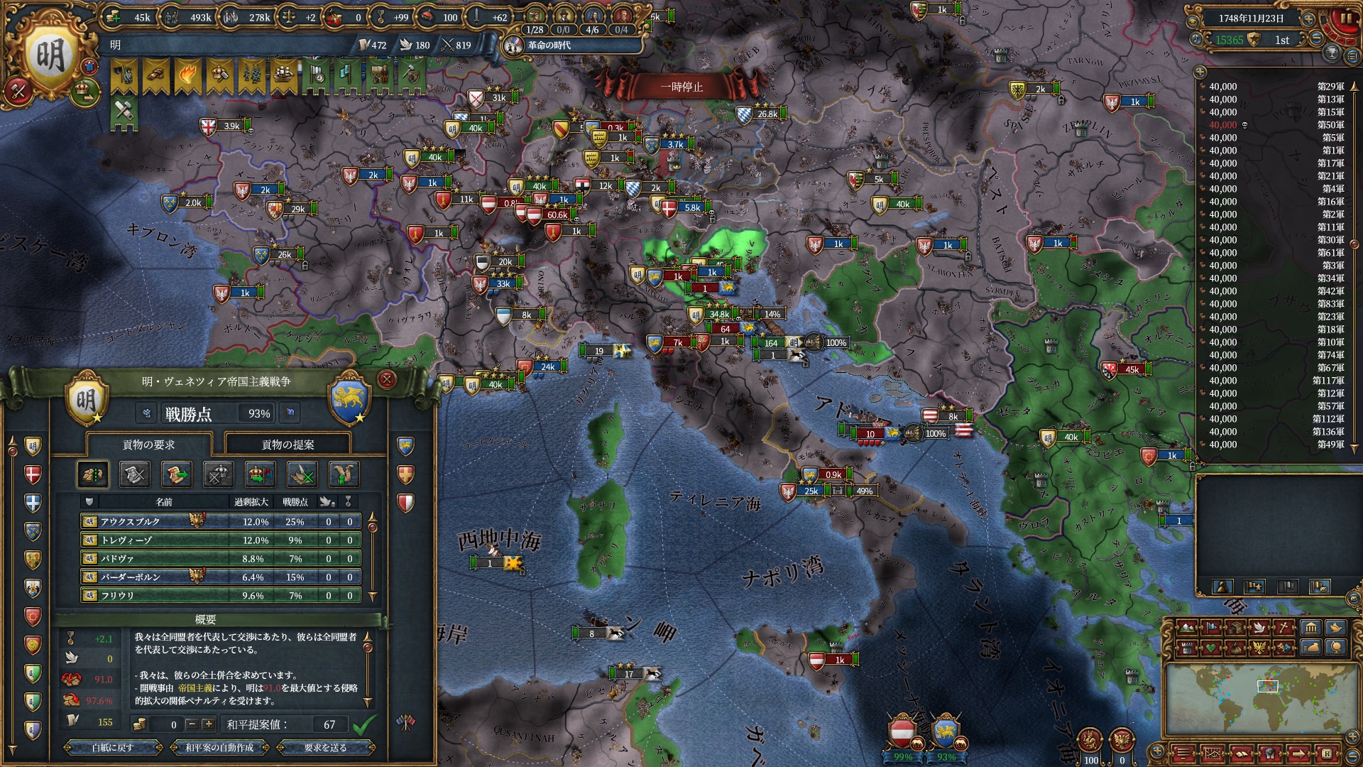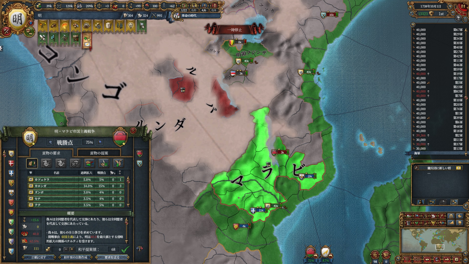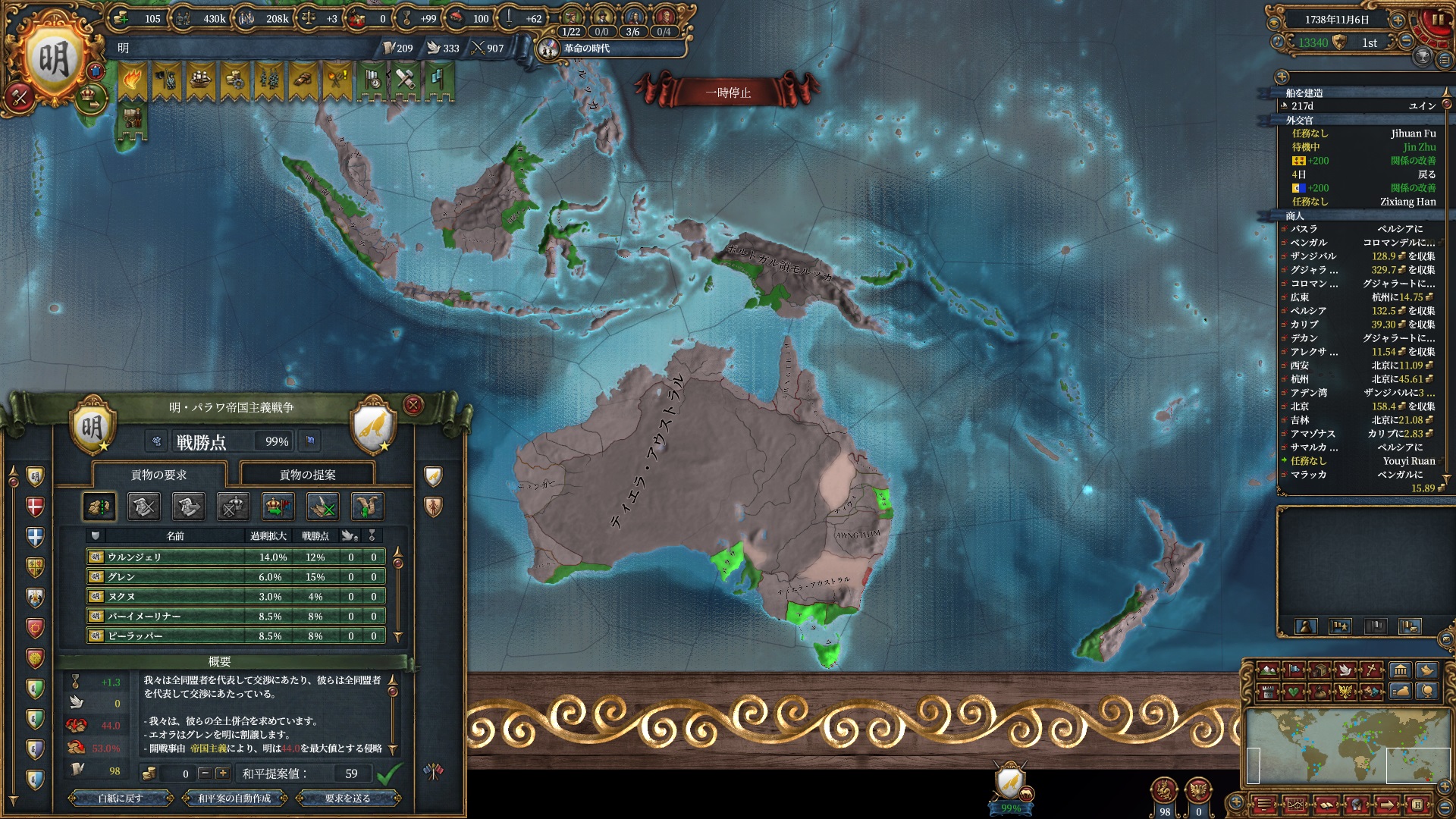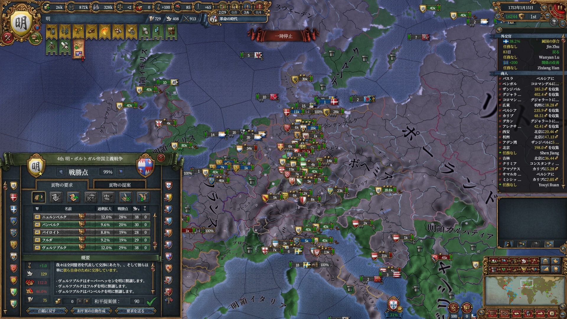 全州取得に必要な戦勝点は100を超えていますが帝国主義CBで75%の領地割譲と組み合わせれば(AEは無視するとして)属国に出来そうです。