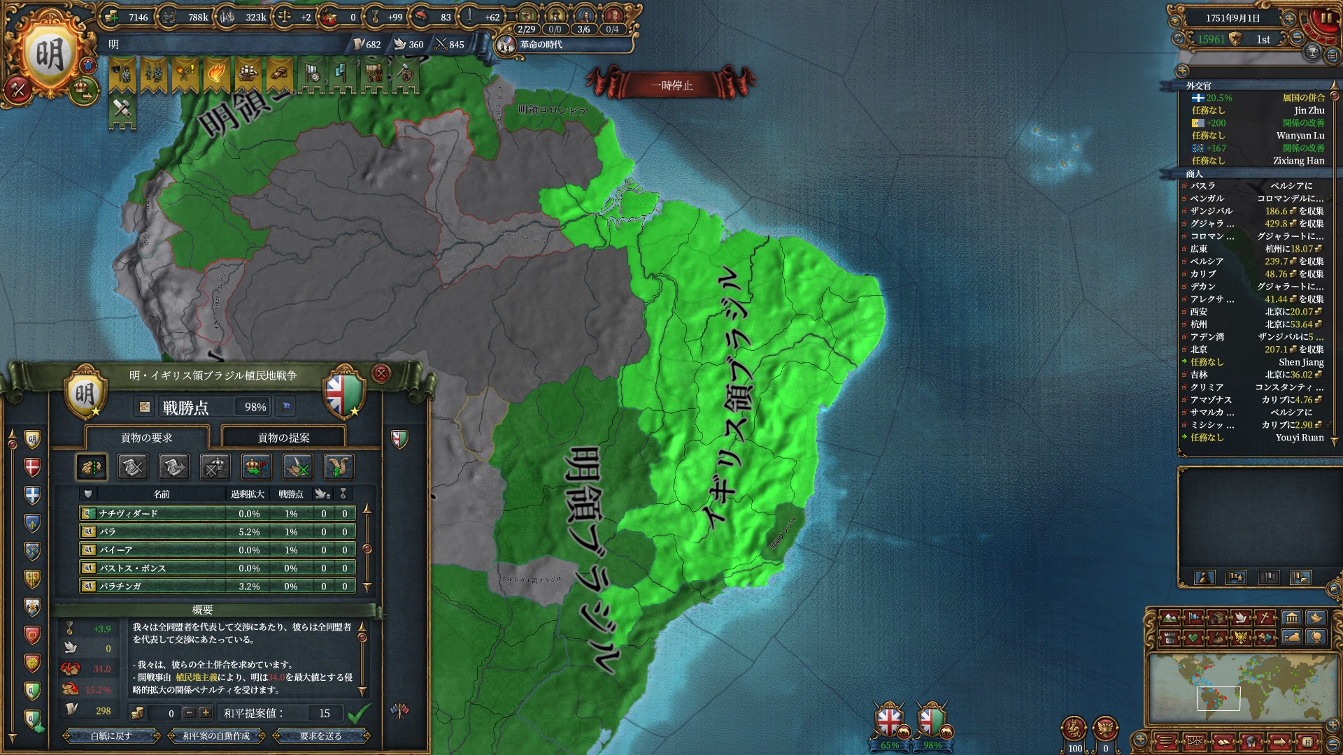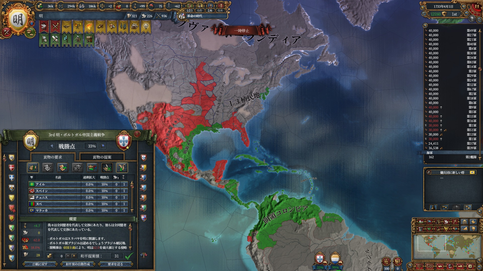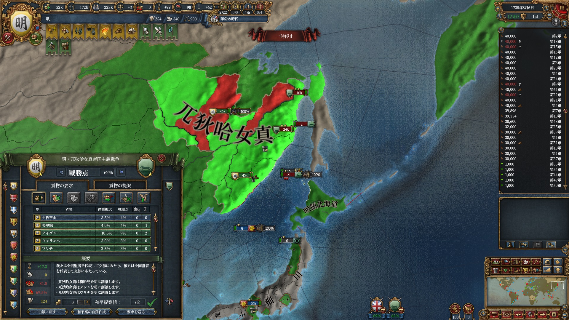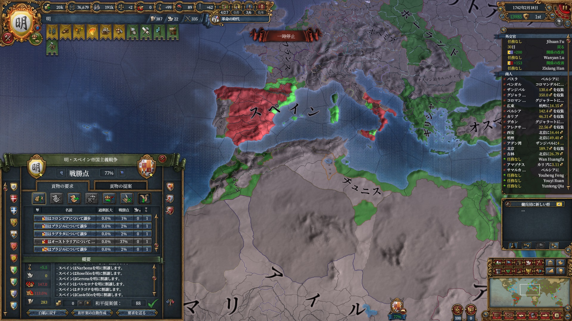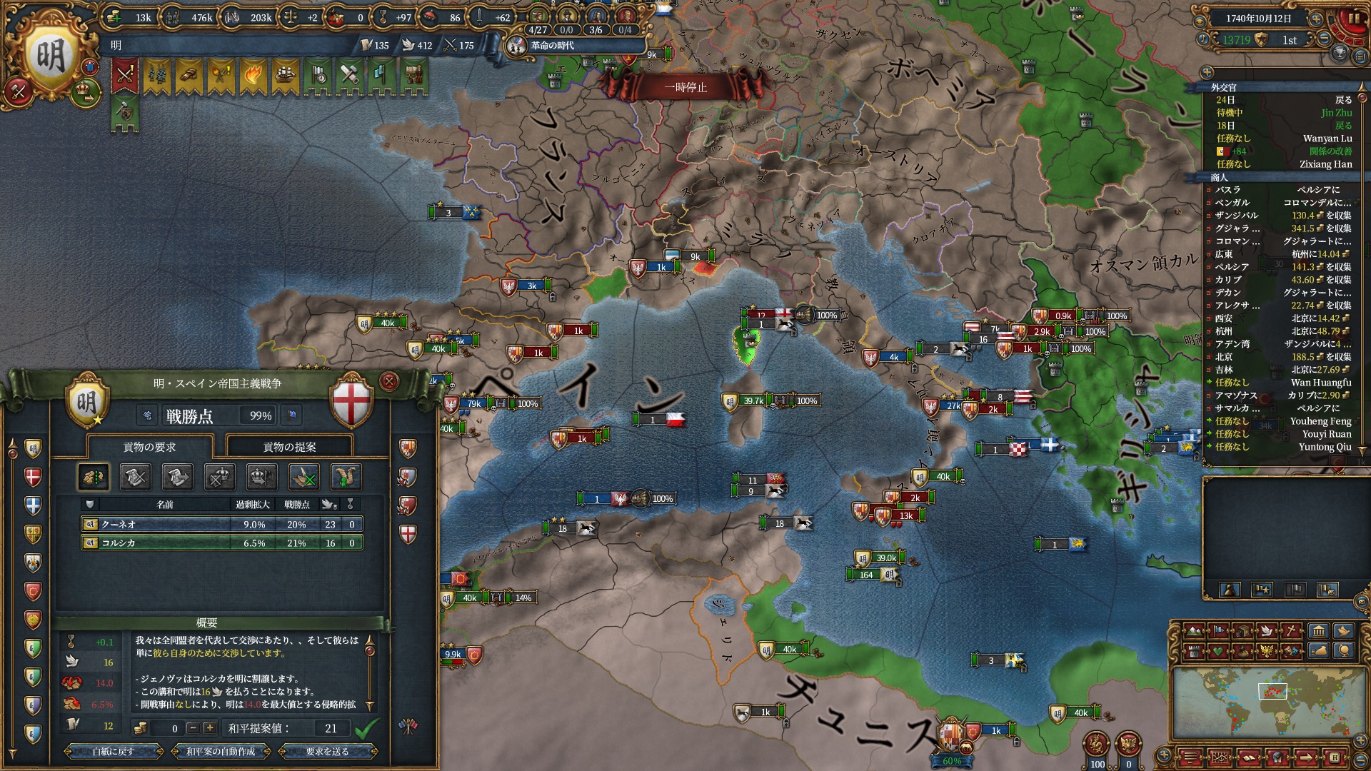 全州取得に必要な戦勝点は100を超えていますが帝国主義CBで75%の領地割譲と組み合わせれば(AEは無視するとして)属国に出来そうです。