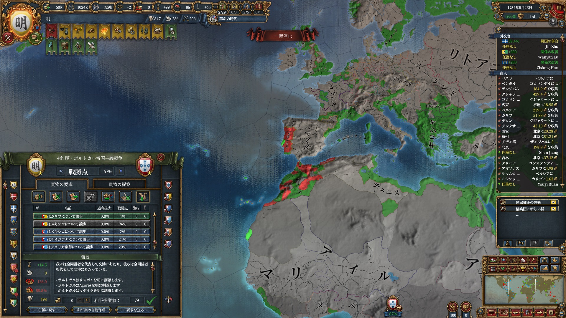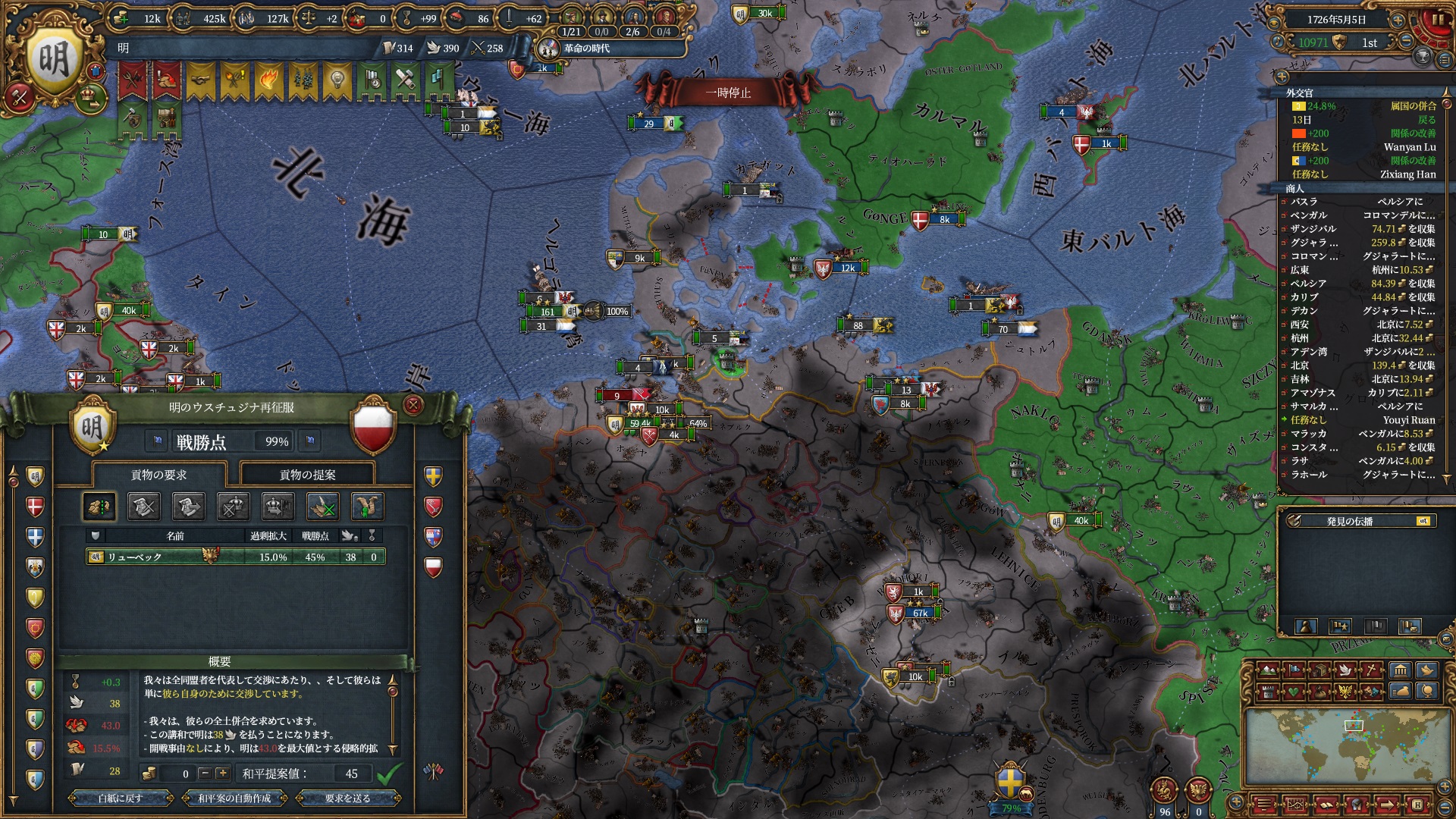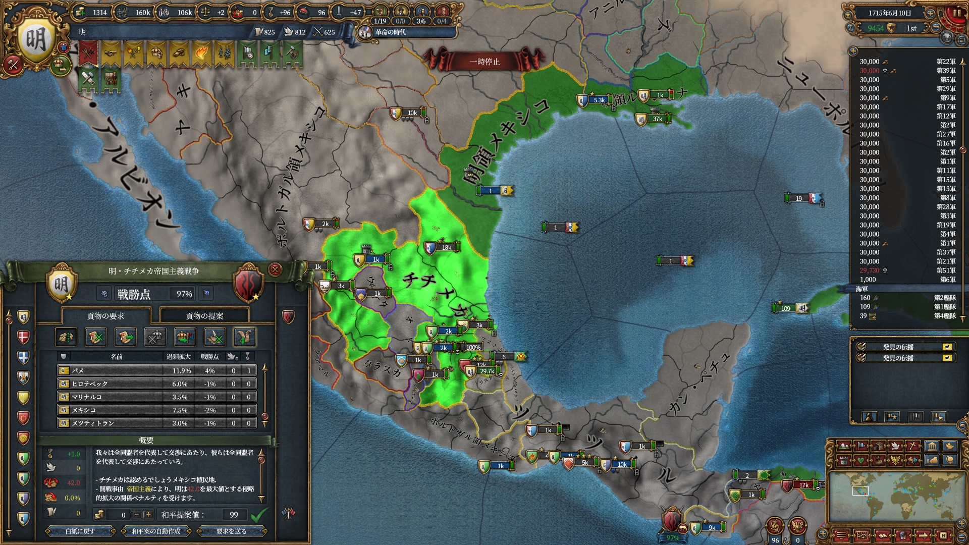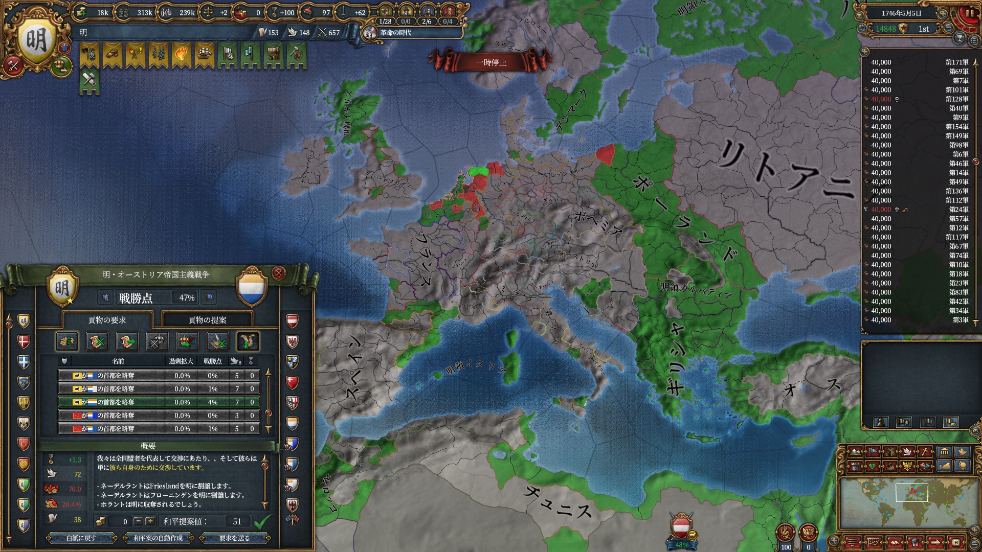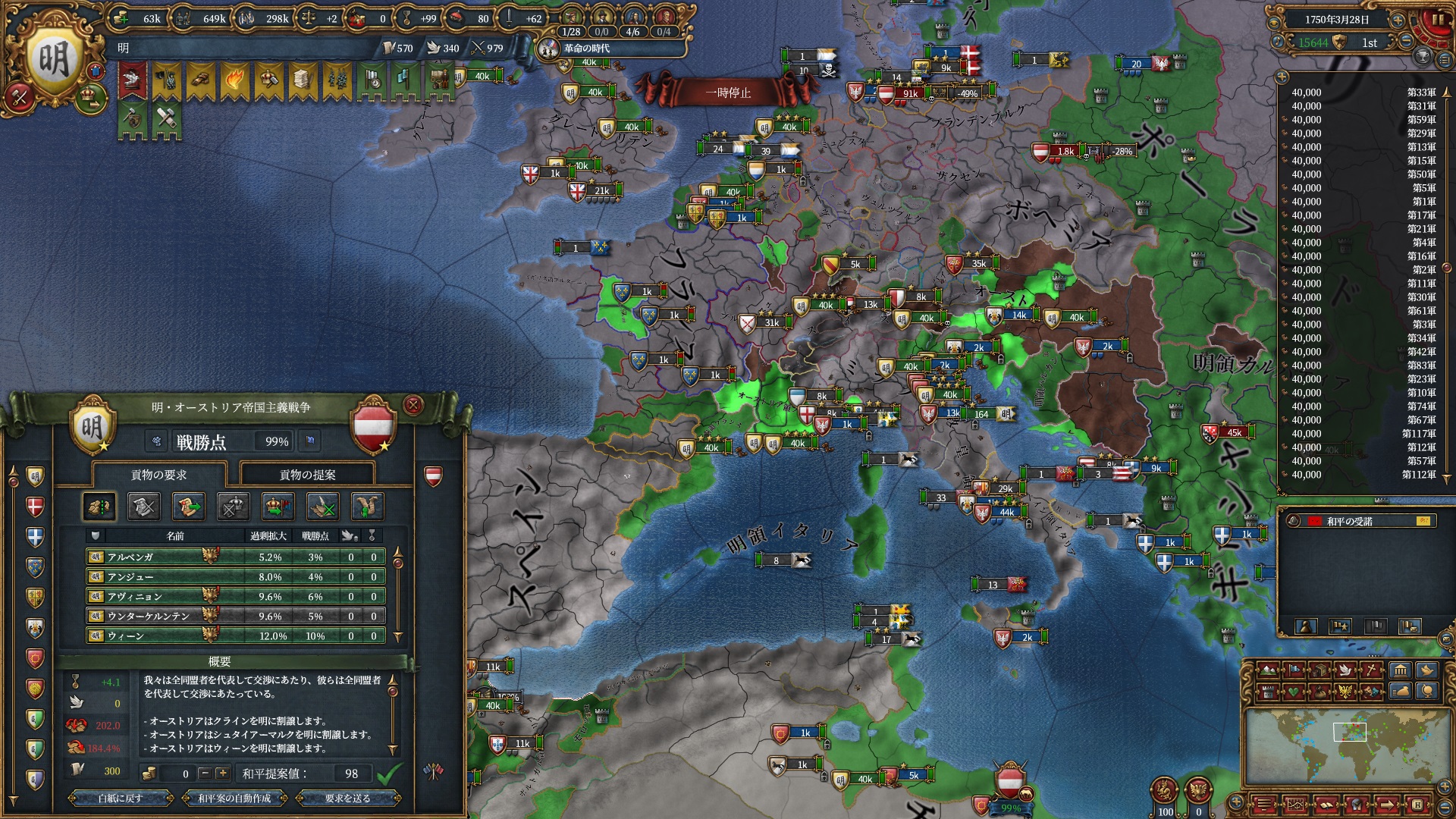 全州取得に必要な戦勝点は100を超えていますが帝国主義CBで75%の領地割譲と組み合わせれば(AEは無視するとして)属国に出来そうです。