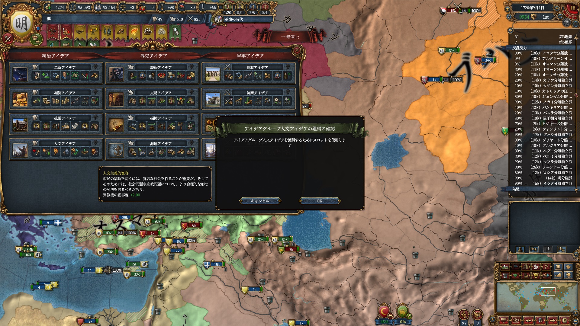 改宗スピードが全く間に合わずひたすら反乱対処に明け暮れて続けているため人文を取得します。