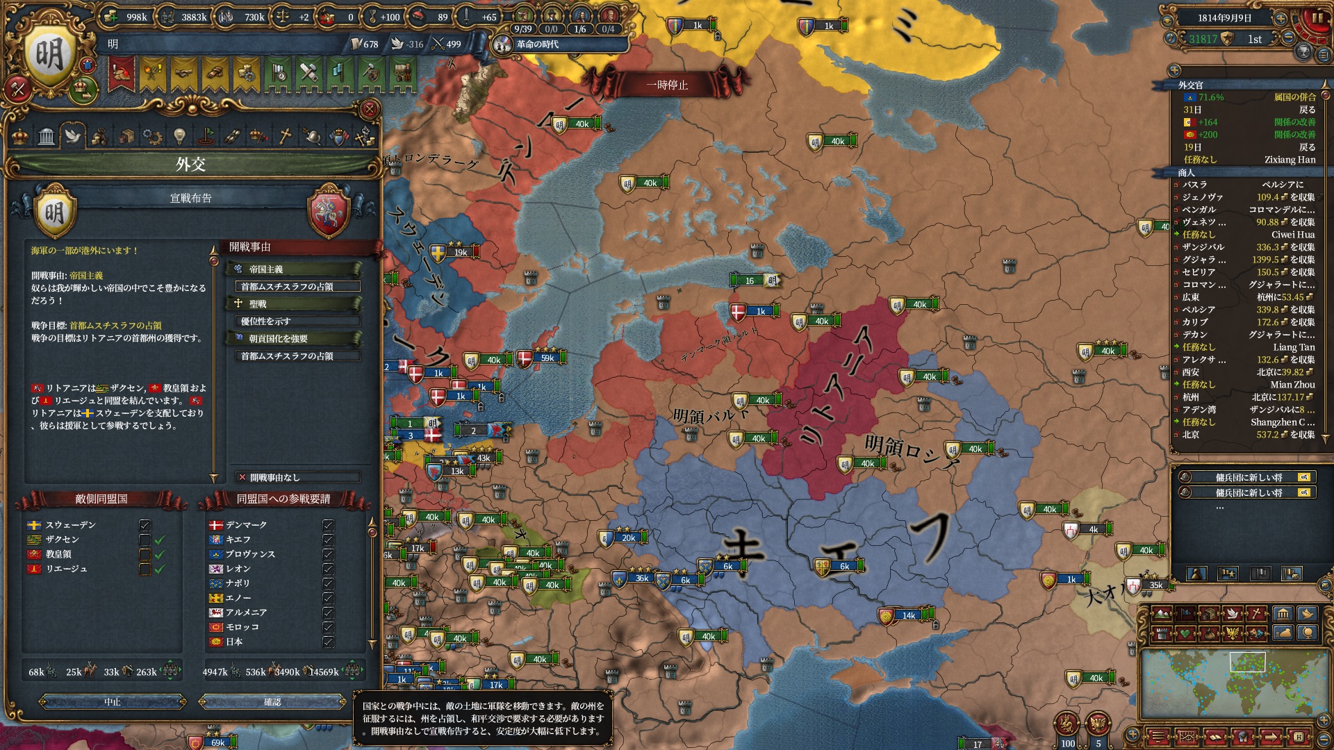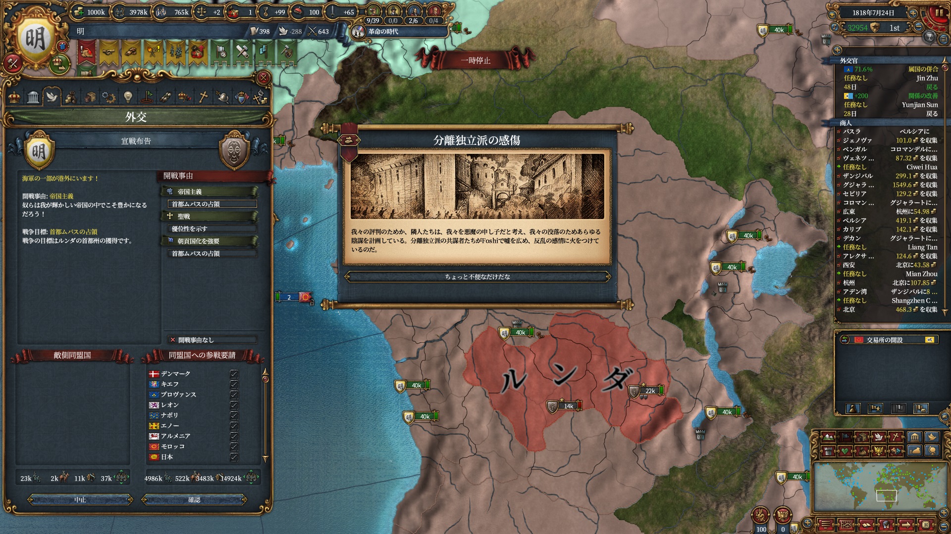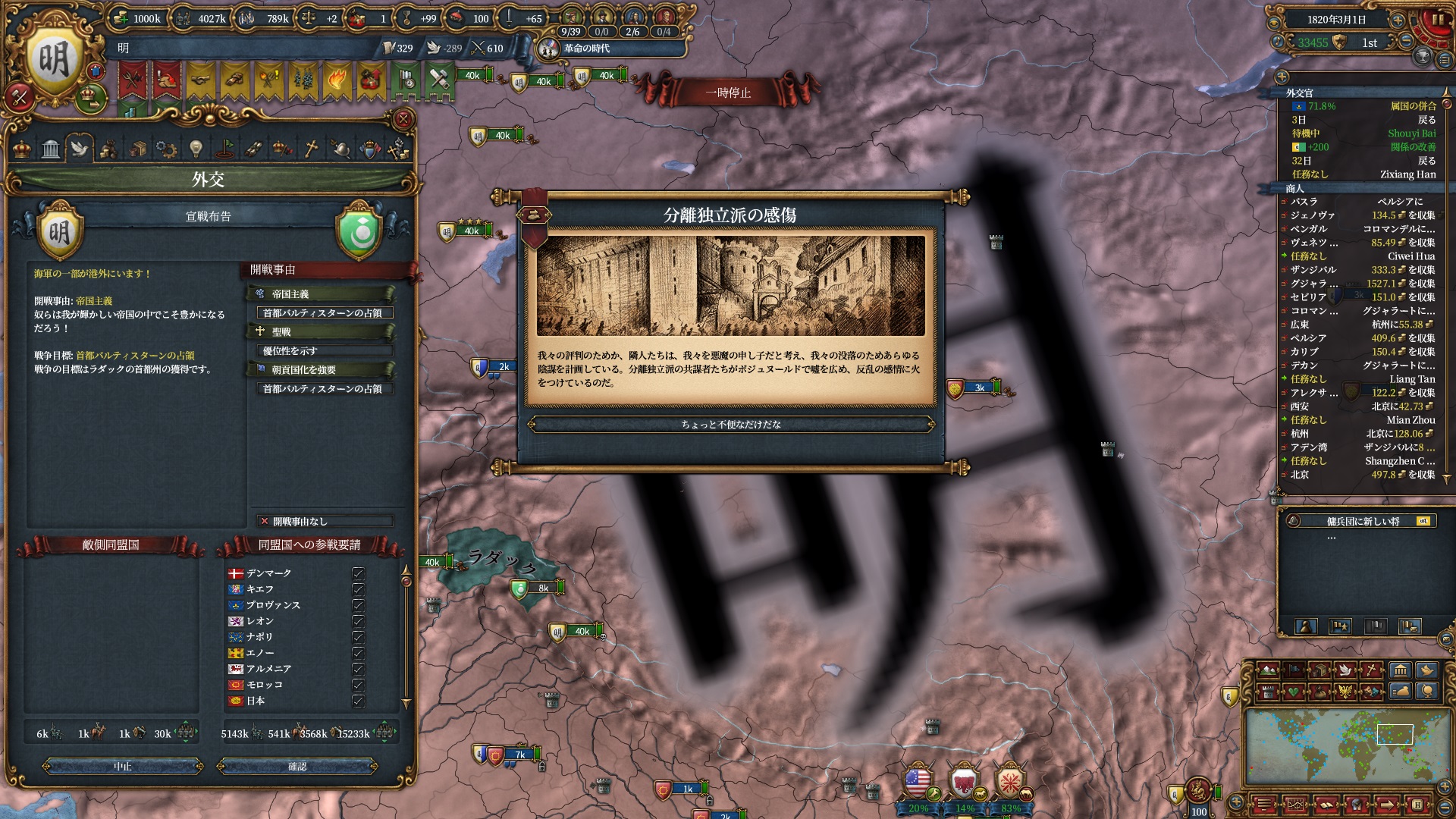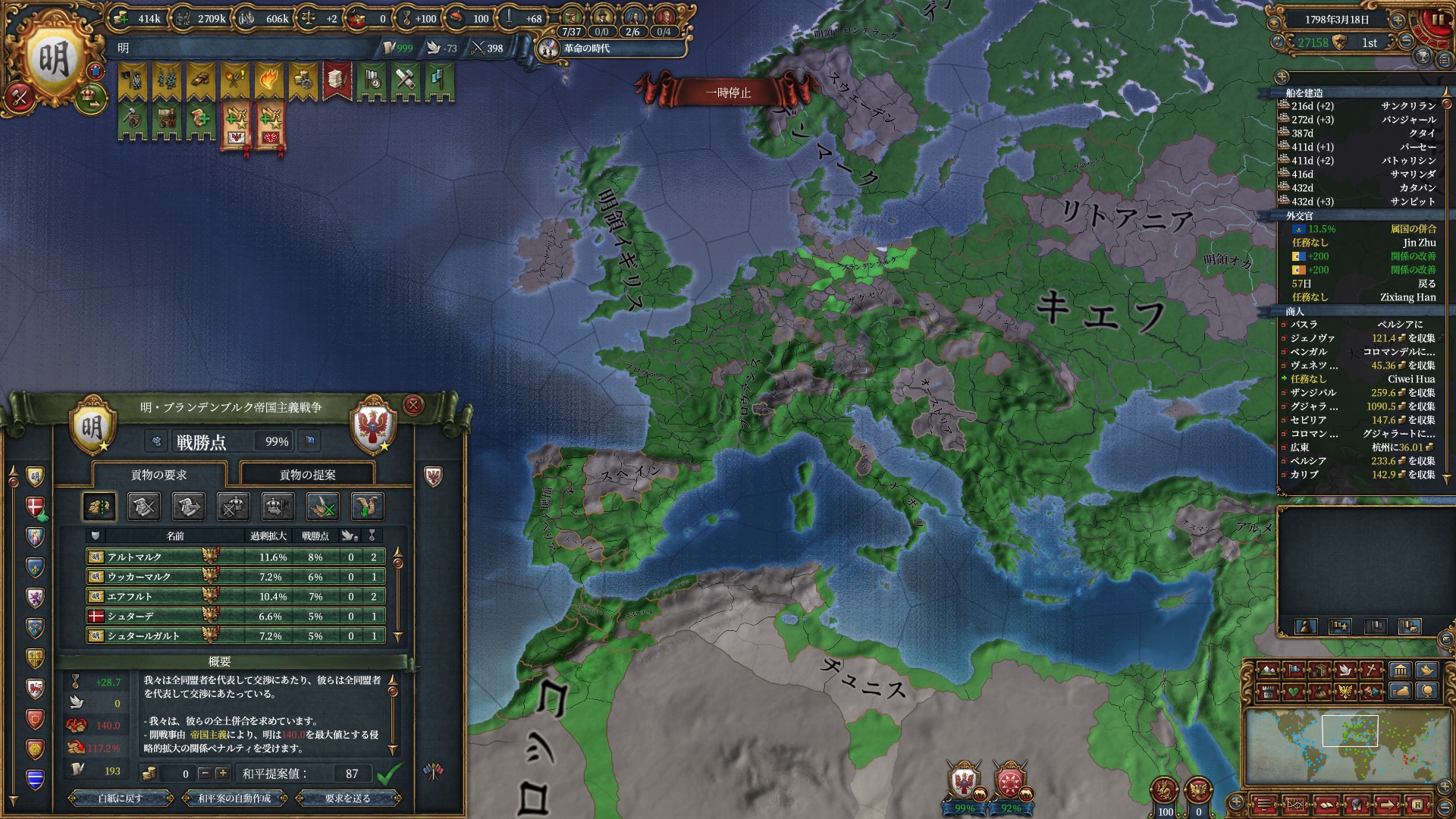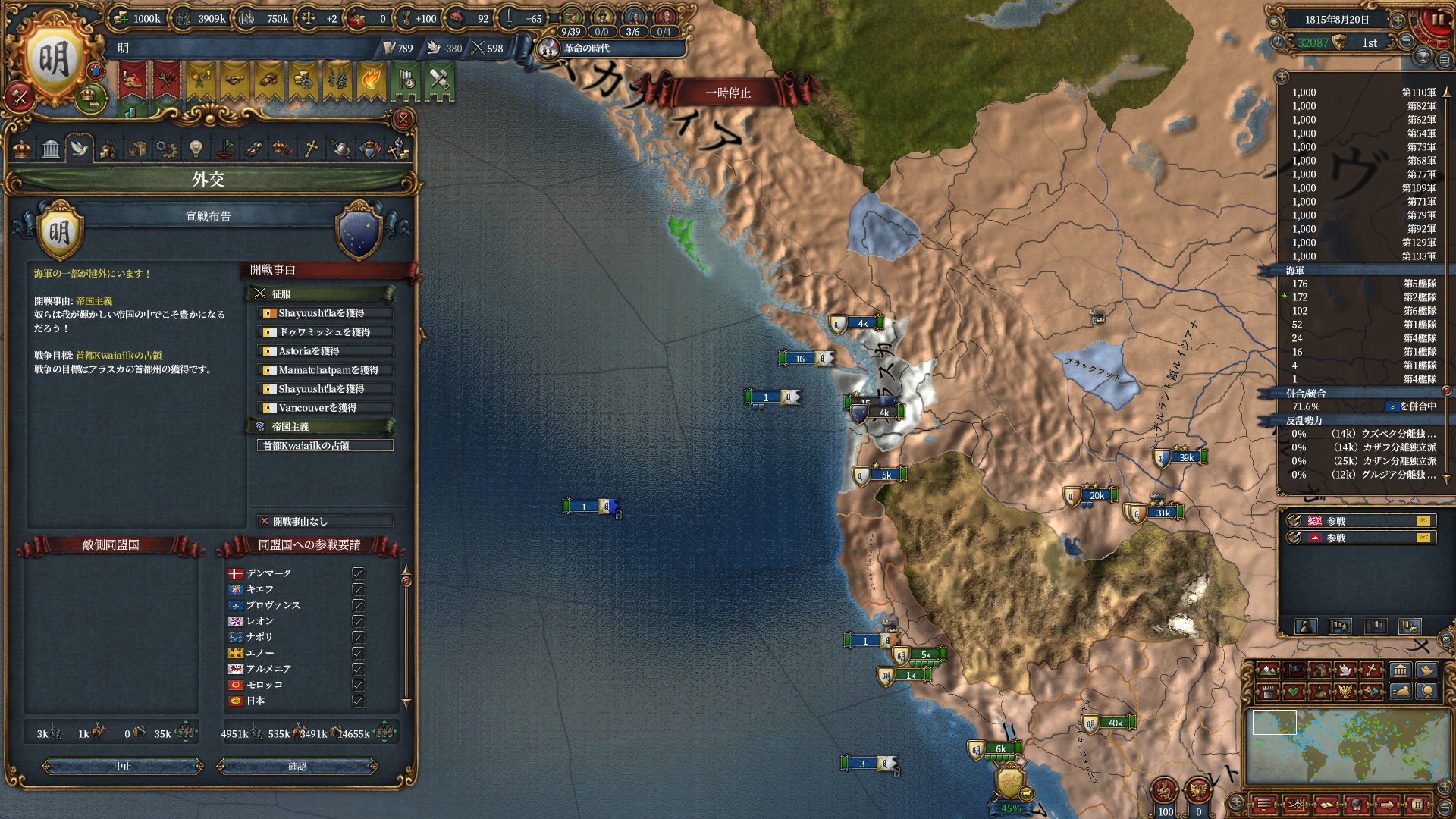 今回の世界線としてはイギリスが伸びたのと対オスマンで苦心した反面他の列強国が軒並み成長に難を抱えており、この2国を抑えた後の残りの掃除が楽になりがちな世界線となっていました。