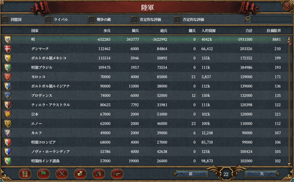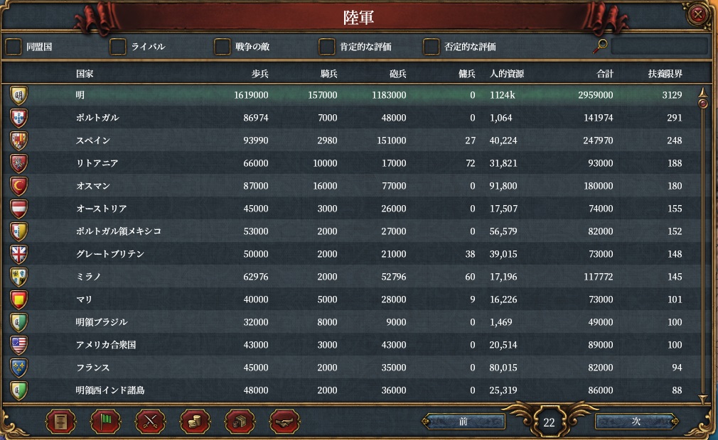 旧verはどれだけやっても30000行く事は無かった記憶ですが、旧大陸の属国分を合わせると35000程となっていました。