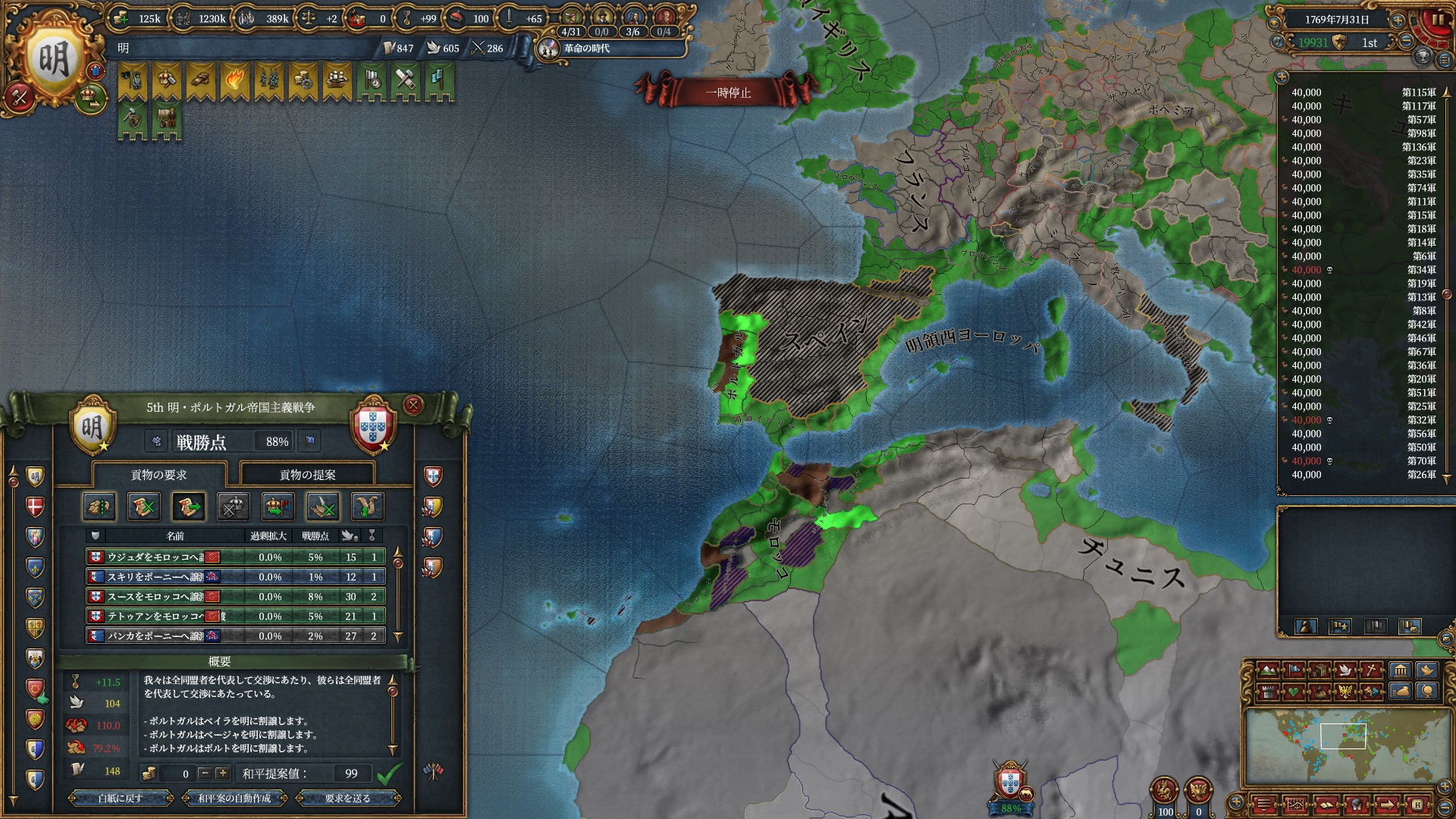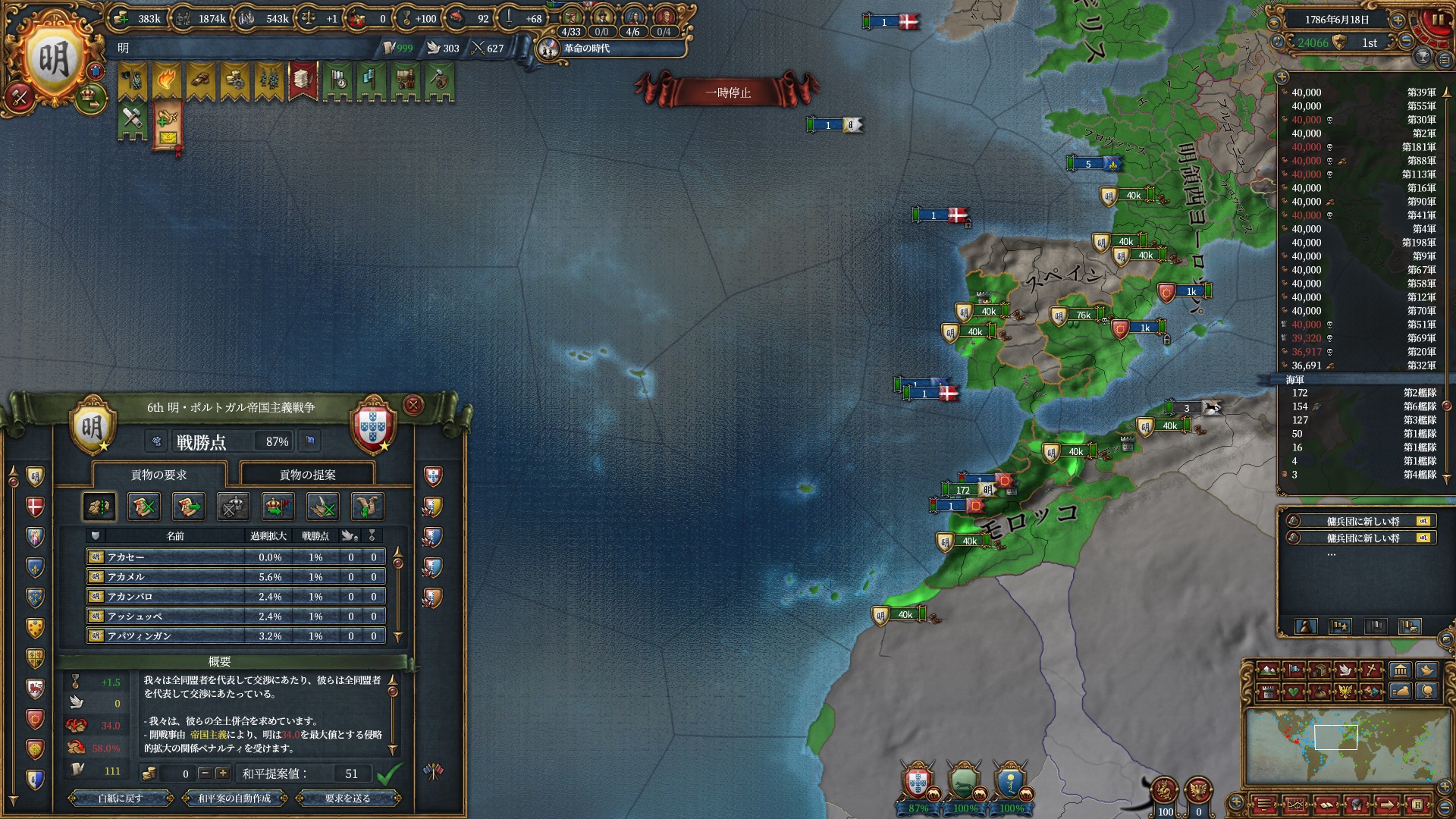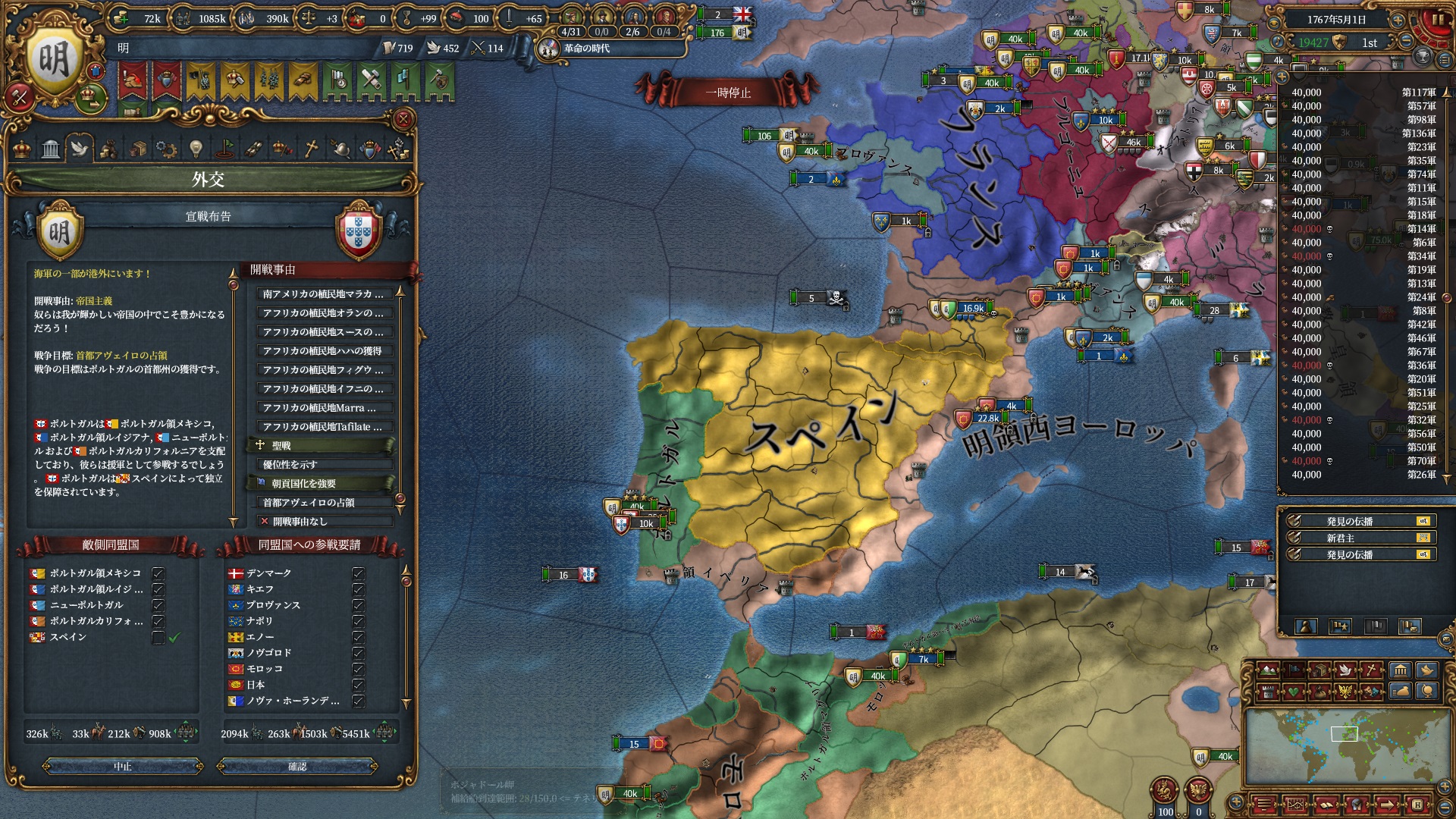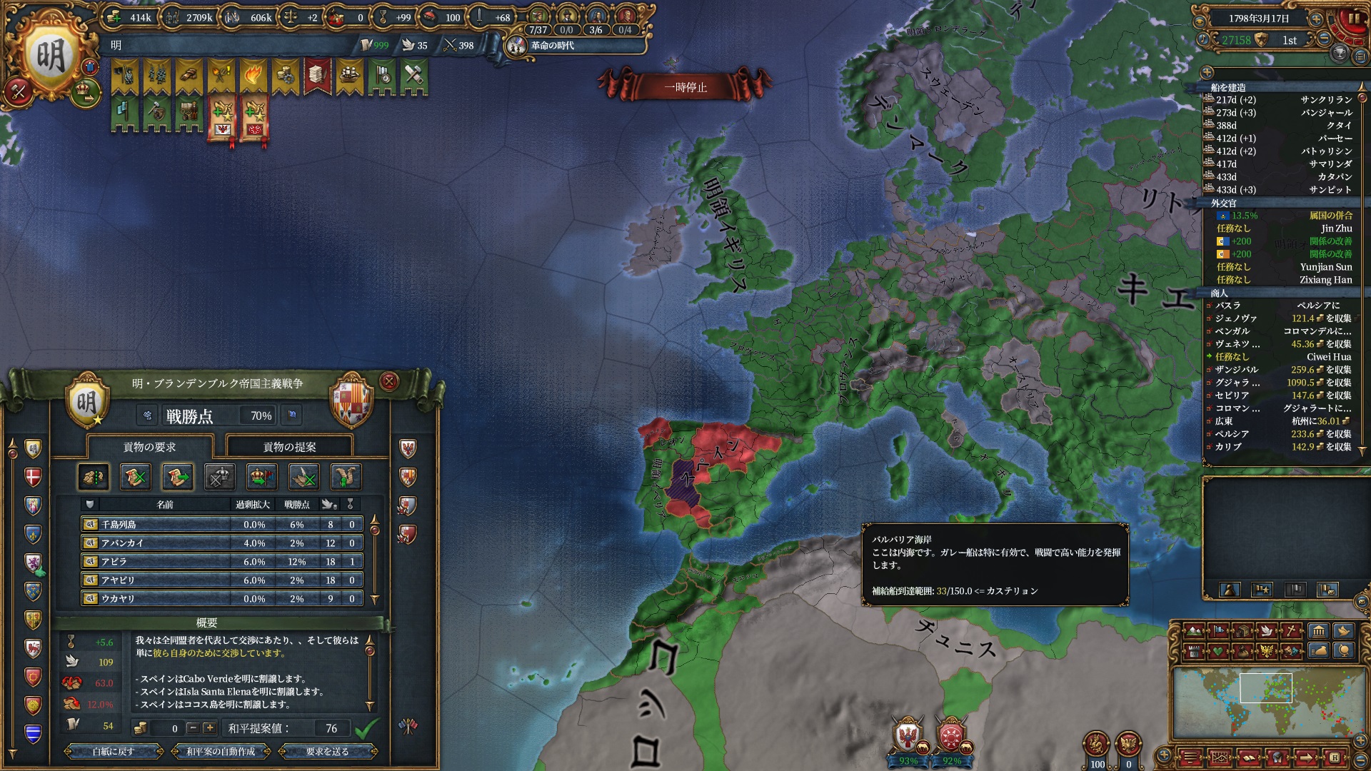 スペインと争っており画面下端に見える島などが欲しかったため宣戦し全土併合しています。
