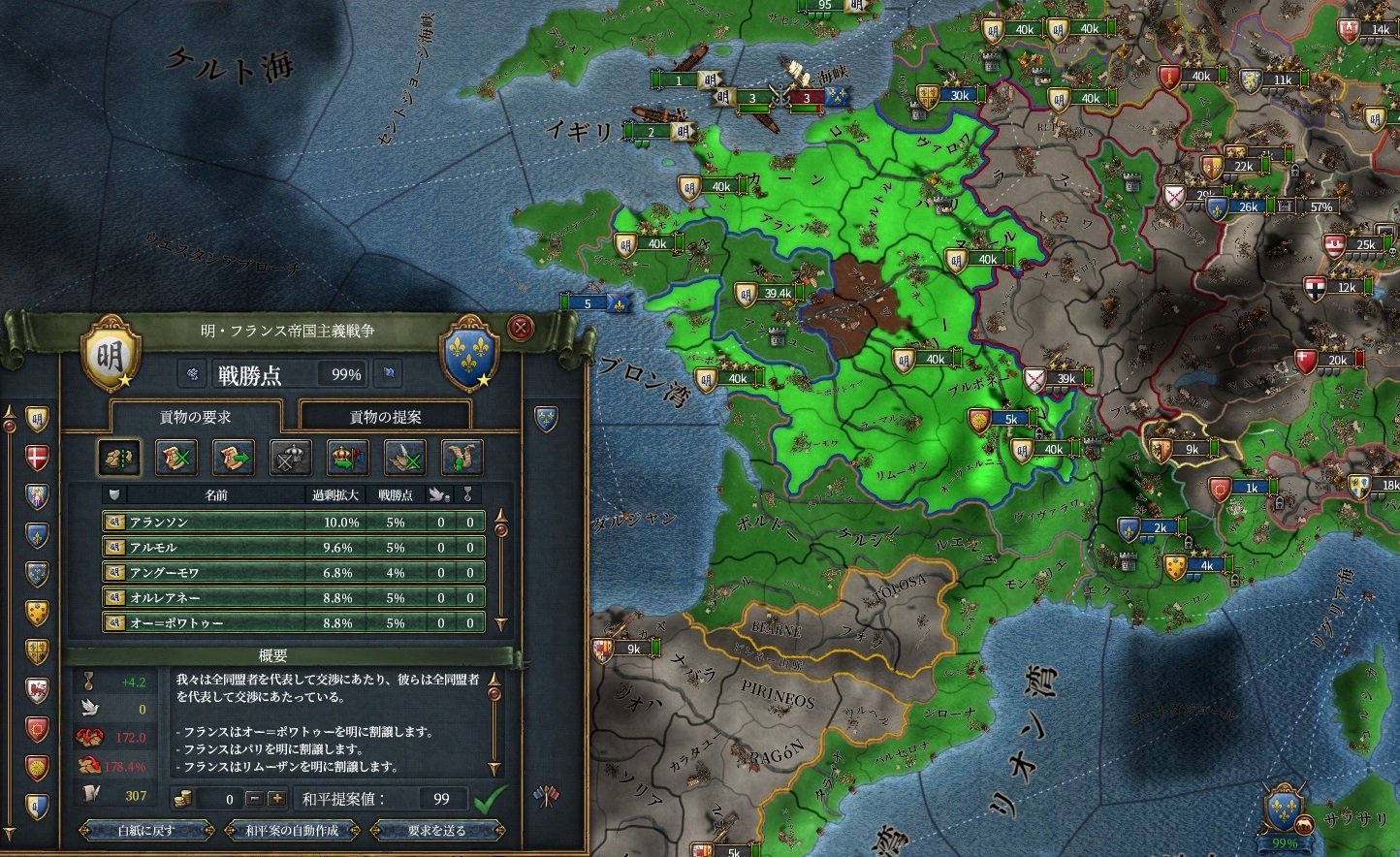 せっかくなので属国レオン領、ナポリへの州返還、OE0地域の割譲で講和します。
