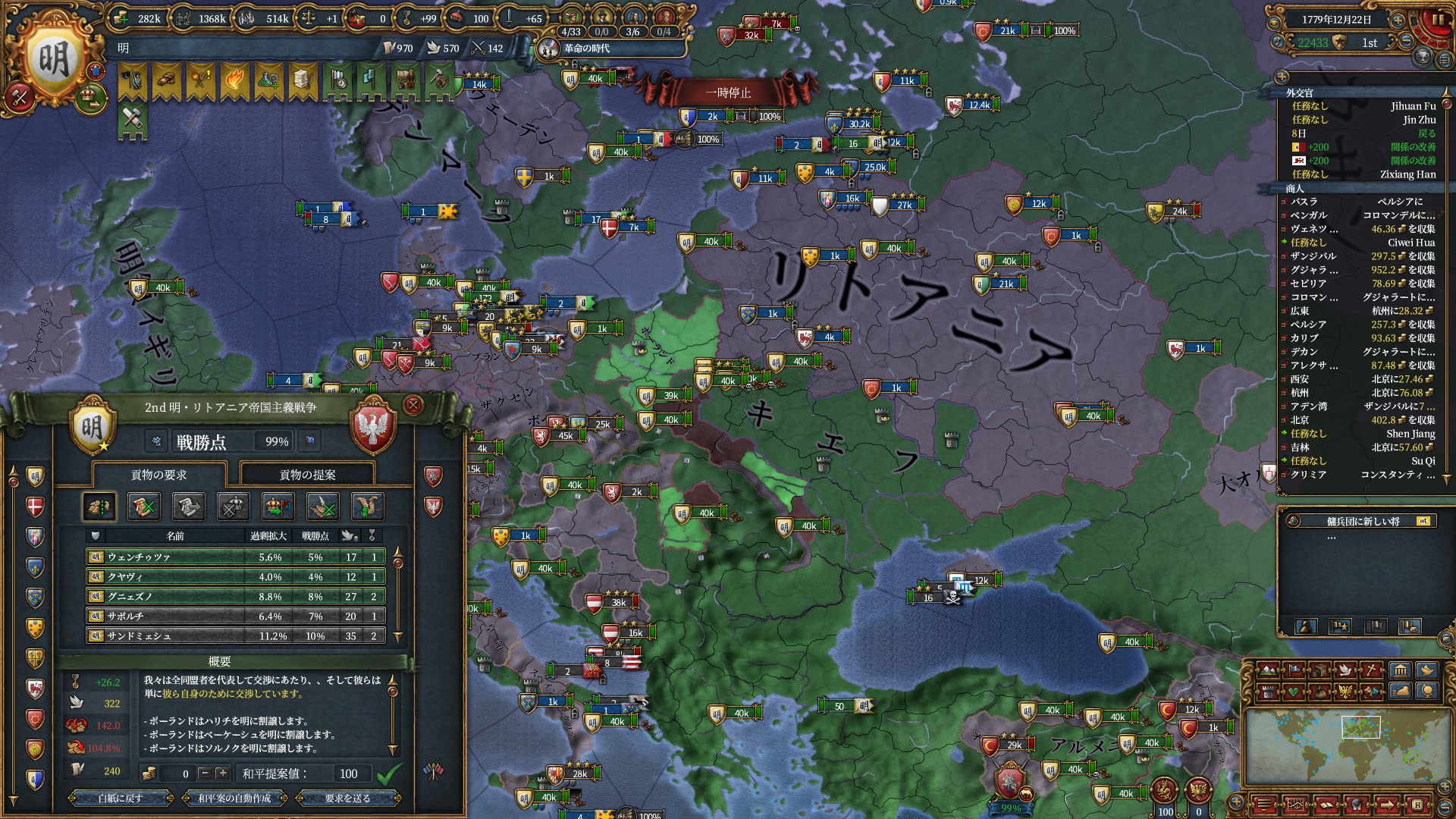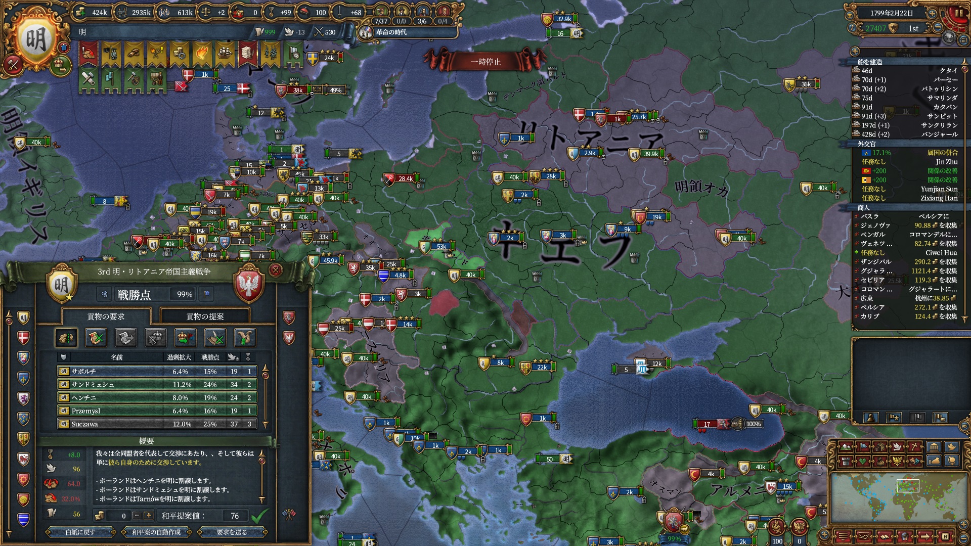 また東欧はコモンウェルスがバラバラで個別対処可、ロシアが弱く絨毯占領だけで一撃併合とかなり楽をしています。