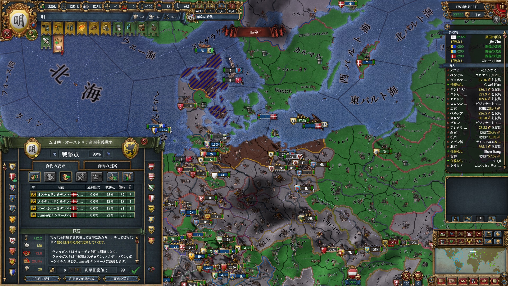 この際オーストリアは白紙和平したのですがスペインとの同盟が切れており残念ながら連打はできませんでした。