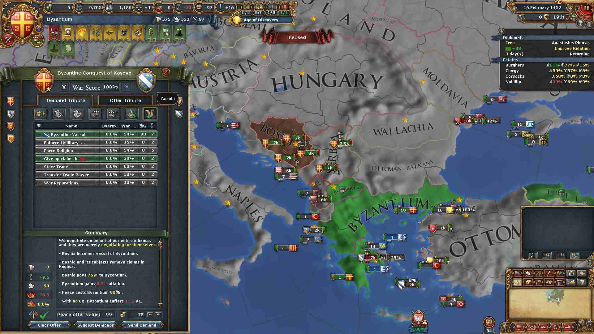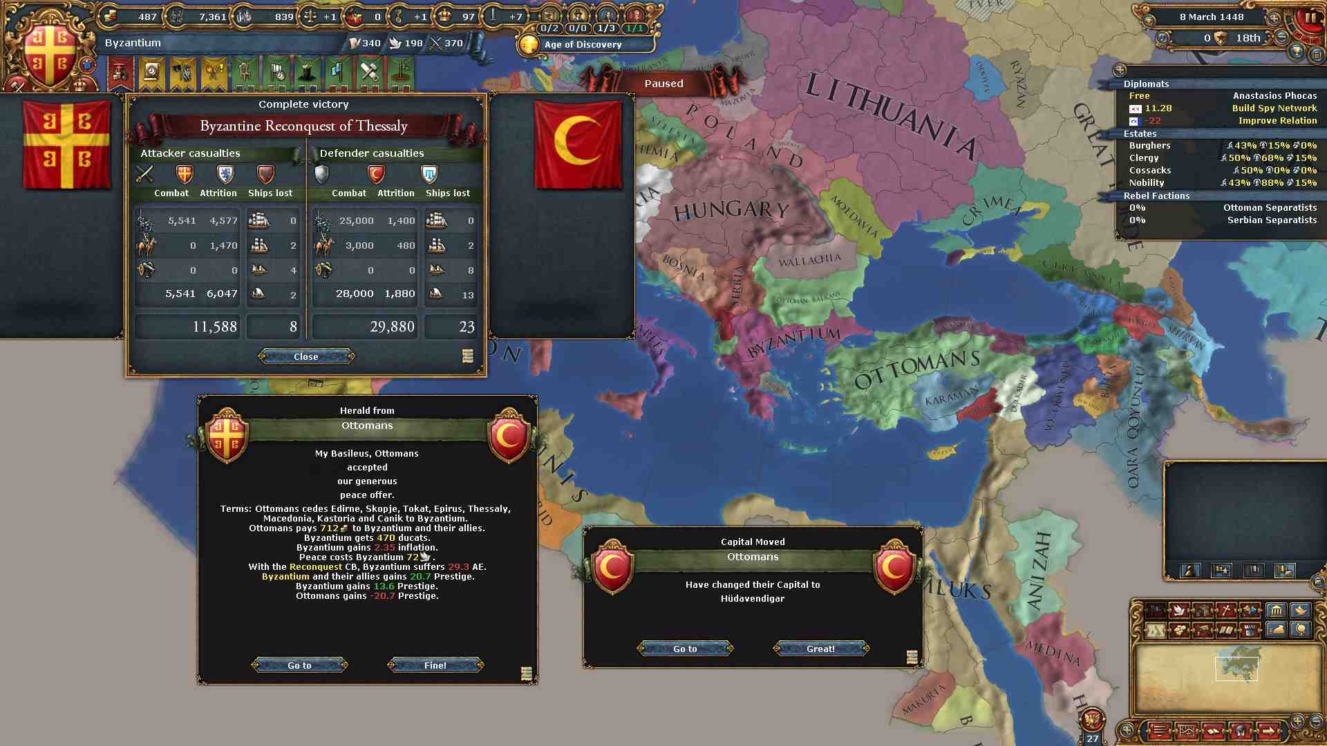 オスマン軍の首都エドリネを落とし、戦勝点MAXの理想的な形で終戦となりました。